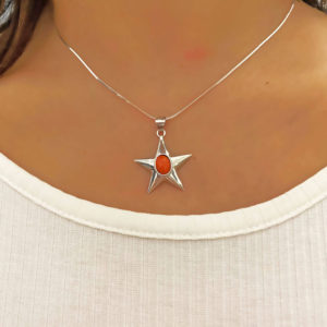 Ciondolo Stella in argento 925 con pietra di corallo naturale, con bagno galvanico di rodio in oro bianco.