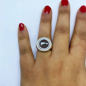 Anello in argento 925, realizzato con metodo della cera persa; con bagno galvanico di rodio in oro bianco; con cammeo sardonico di 14mm inciso a mano con tema natalizio e impreziosito con pietre zirconia. Misura regolabile
