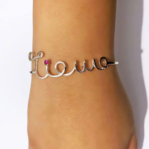 Bracciale realizzato a mano con filo d’argento 925 con pietra zirconia, disponibile con bagno galvanico in oro bianco, oro giallo, oro rosa. Personalizzabile con parole e nomi a scelta.