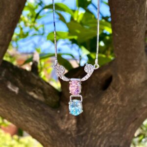 Collieur in argento 925, con bagno di rodio in oro bianco, con elemento centrale in argento, zirconi e pietre dure colorate. È possibile avere la collana con due pietre rosa o due pietre celesti.