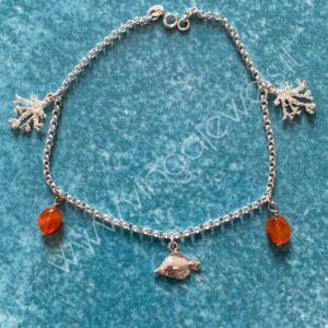 Cavigliera con motivi marini in argento 925 e bagno di rodio in oro bianco e gocce di corniola naturale