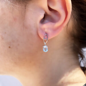 Orecchini pendenti in argento 925, con bagno galvanico di rodio in oro bianco, con pietre di topazio azzurro idrotermali 5×7 mm.
