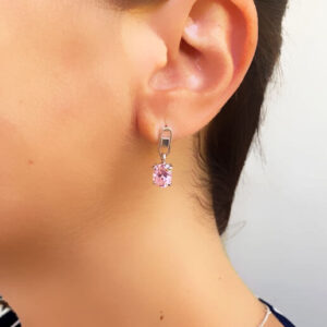 Orecchini pendenti in argento 925, con bagno galvanico di rodio in oro bianco, con pietre zirconia rosa 6×8 mm.