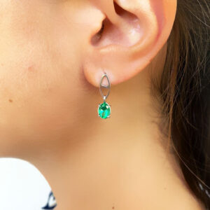 Orecchini pendenti in argento 925, con bagno galvanico di rodio in oro bianco, con pietre smeraldo zirconia 5×7 mm.