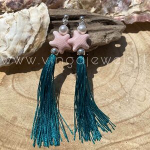 Splendide perle Swarovski, delicate stelle marine rosate in vetro-ceramica , fluttuanti frange verdi smeraldo, il tutto montato in argento 925 con bagno di rodio in oro bianco: ecco la nostra rappresentazione di una Sirenetta. -
