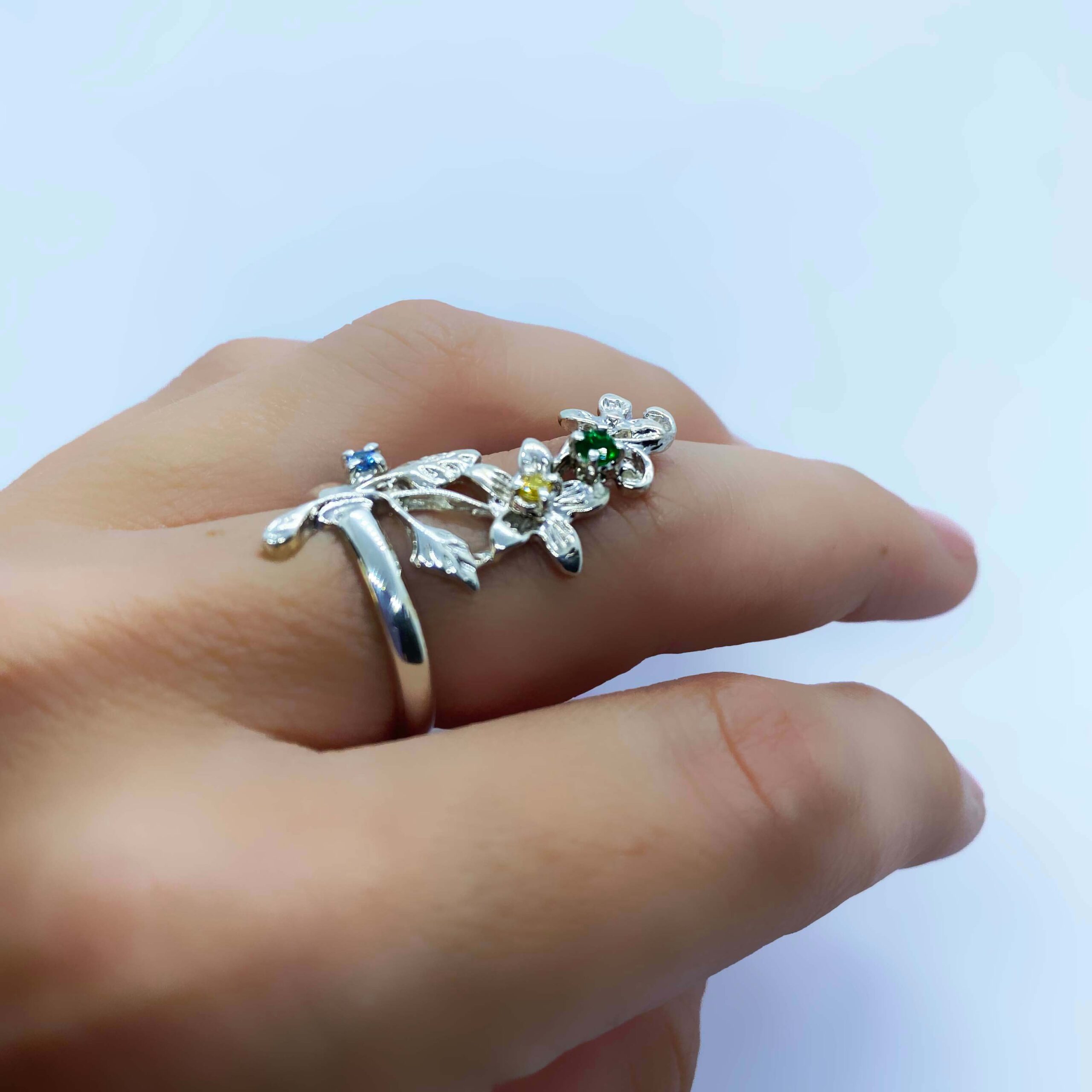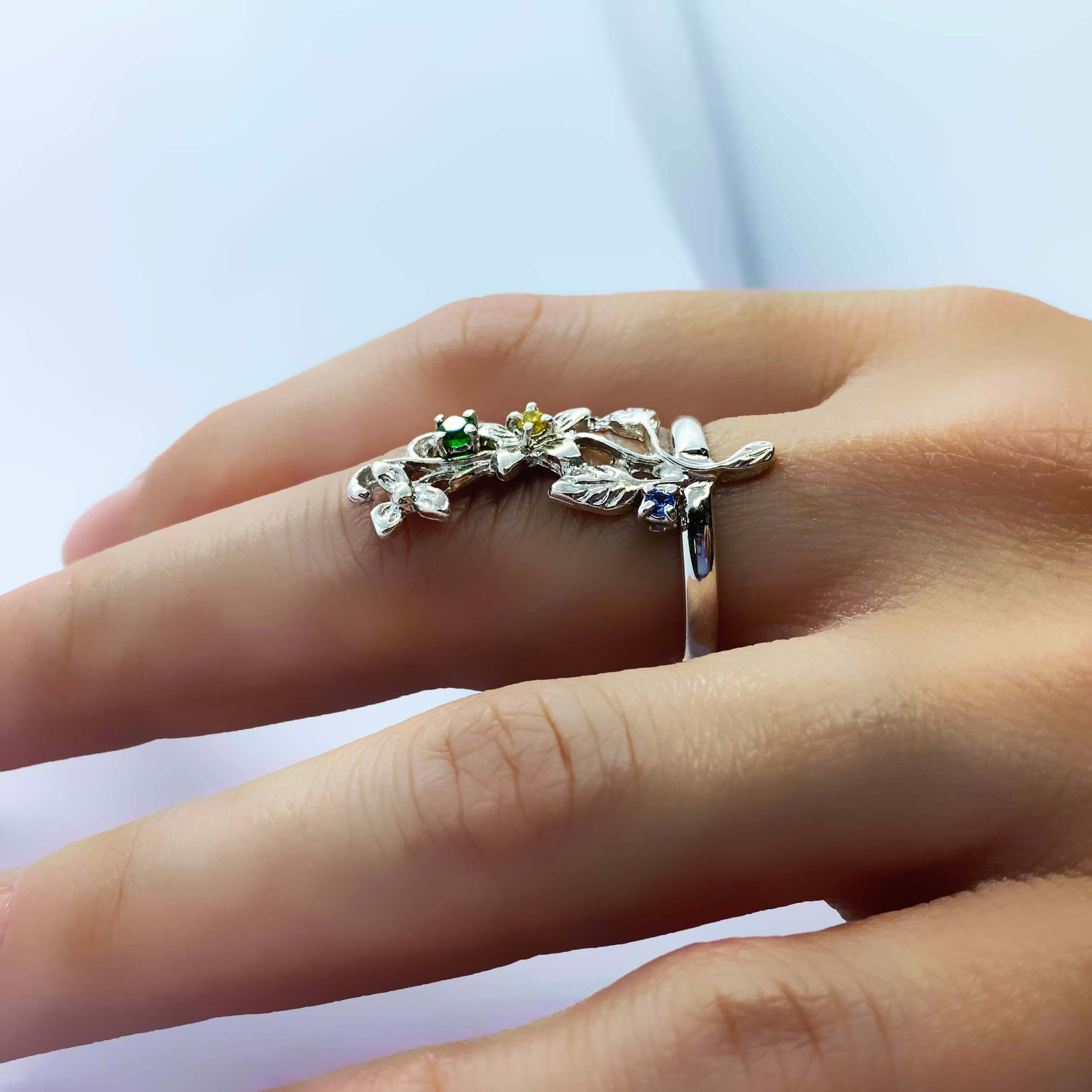 Anello armonia floris in argento 925, con bagno galvanico di rodio in oro bianco, con pietre zirconia di colore azzurro, giallo e verde,