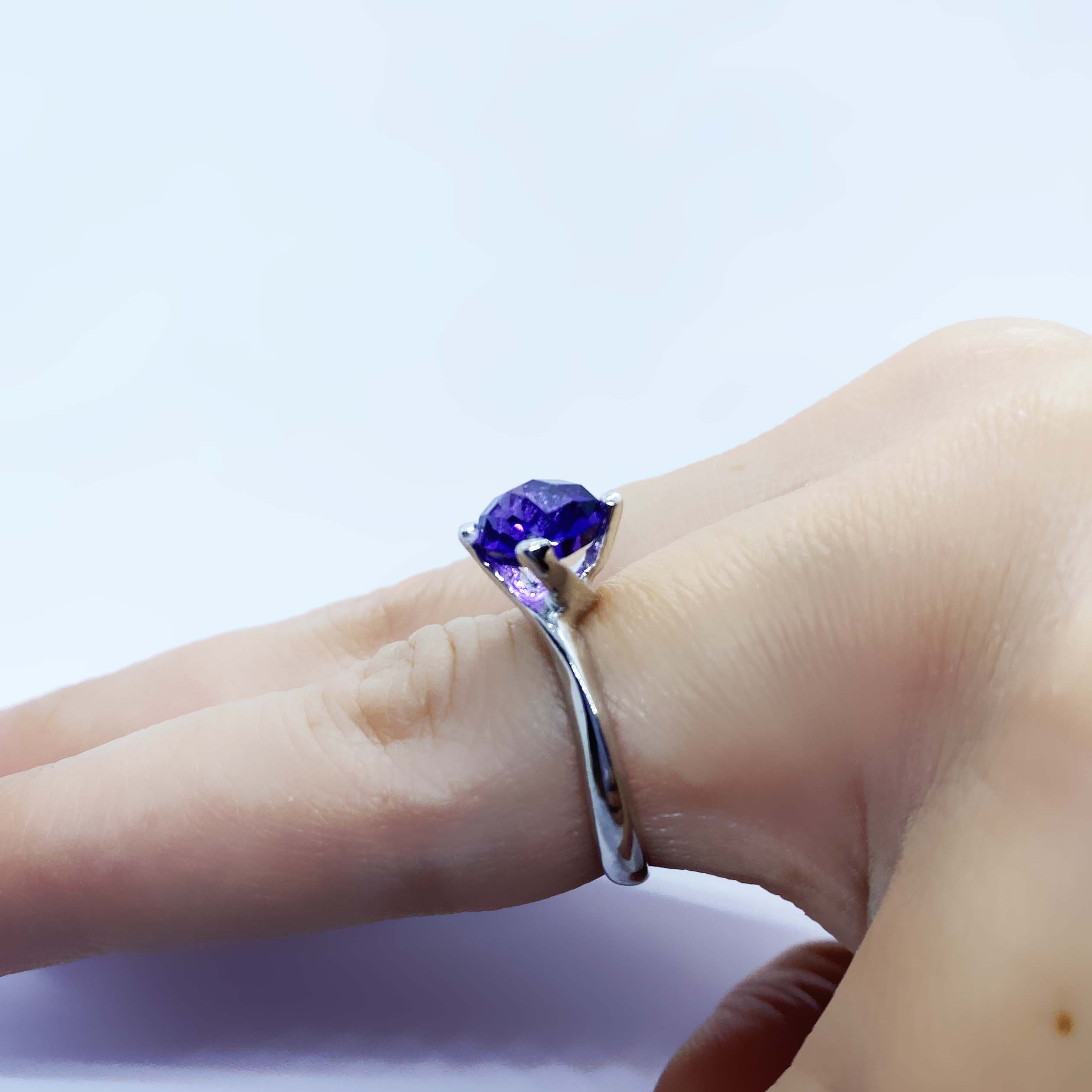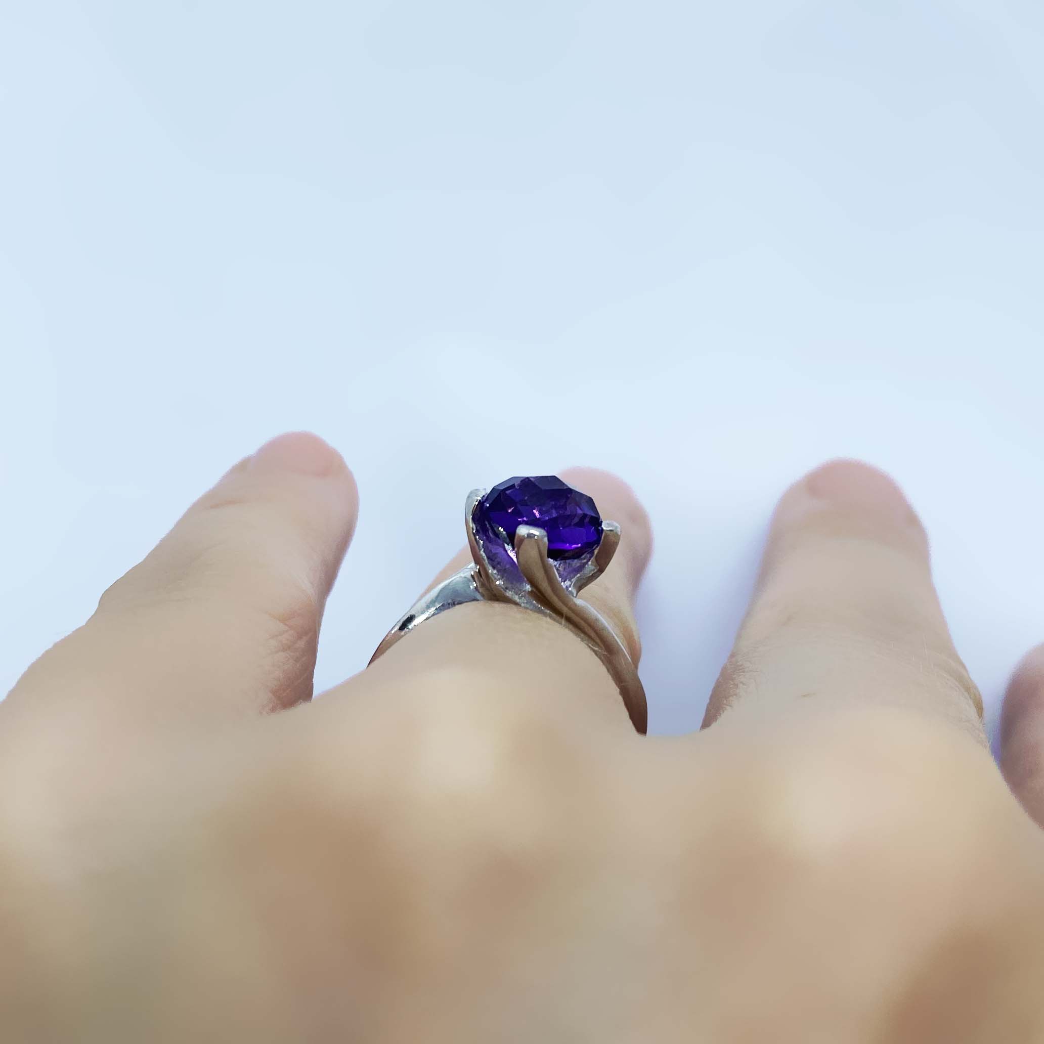 Anello Solitario in argento 925, con bagno galvanico di rodio in oro bianco, con pietra di colore Ametista di mm 10, misura 15 (disponibile, su richiesta, in tutte le misure).