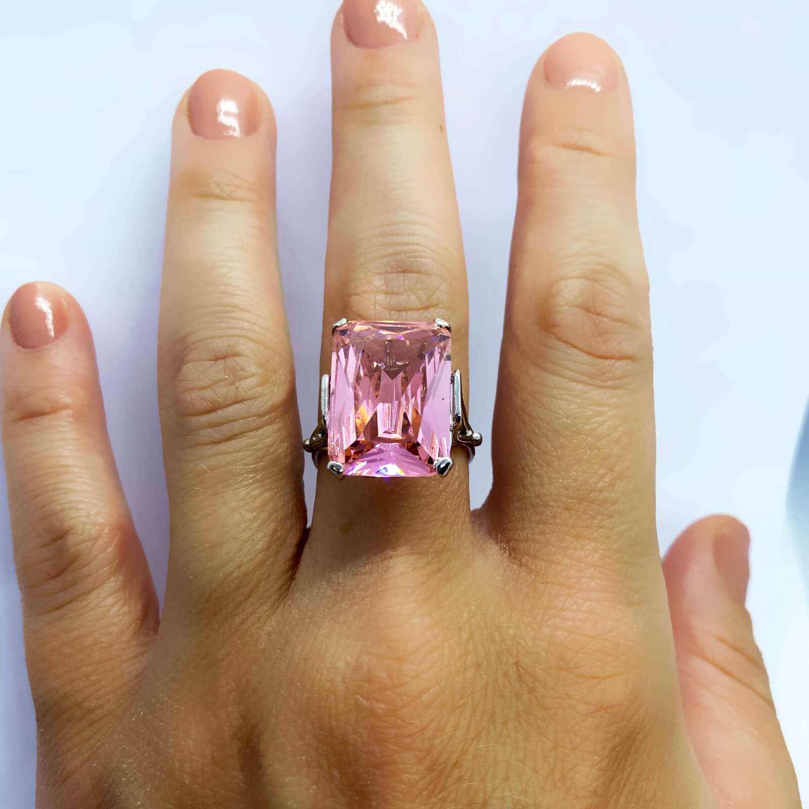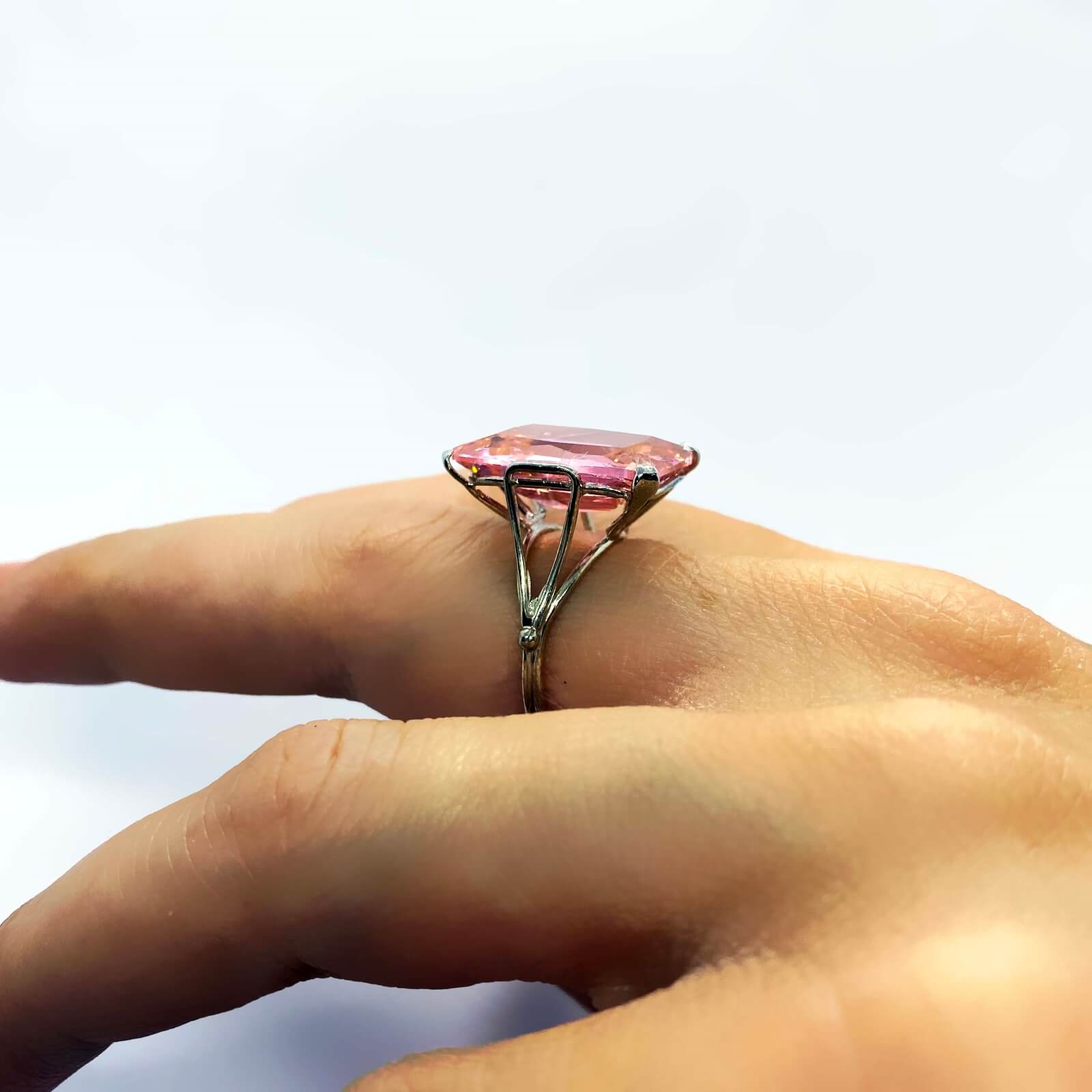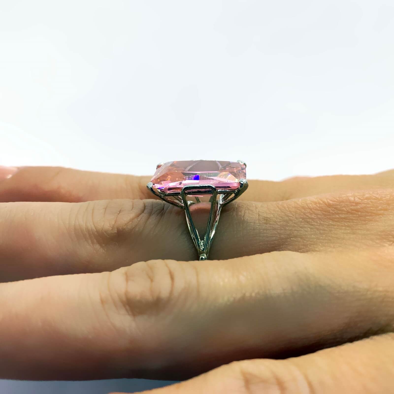 Anello in argento 925, con bagno galvanico di rodio in oro bianco, con pietra zirconia di colore rosa 18×13 mm, misura 17,5 (disponibile, su richiesta, in tutte le misure).