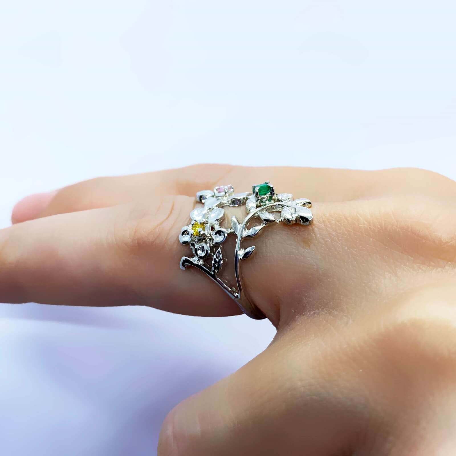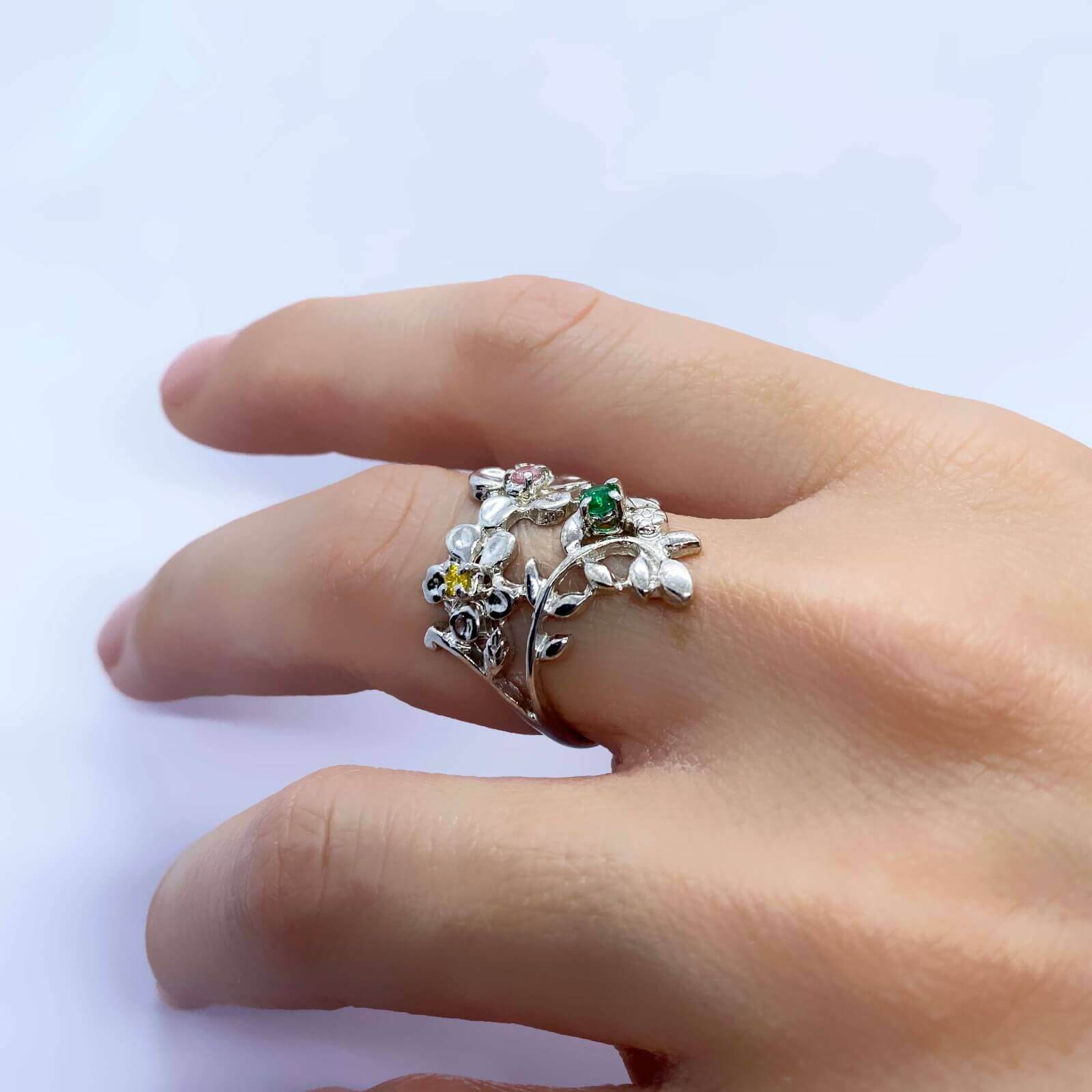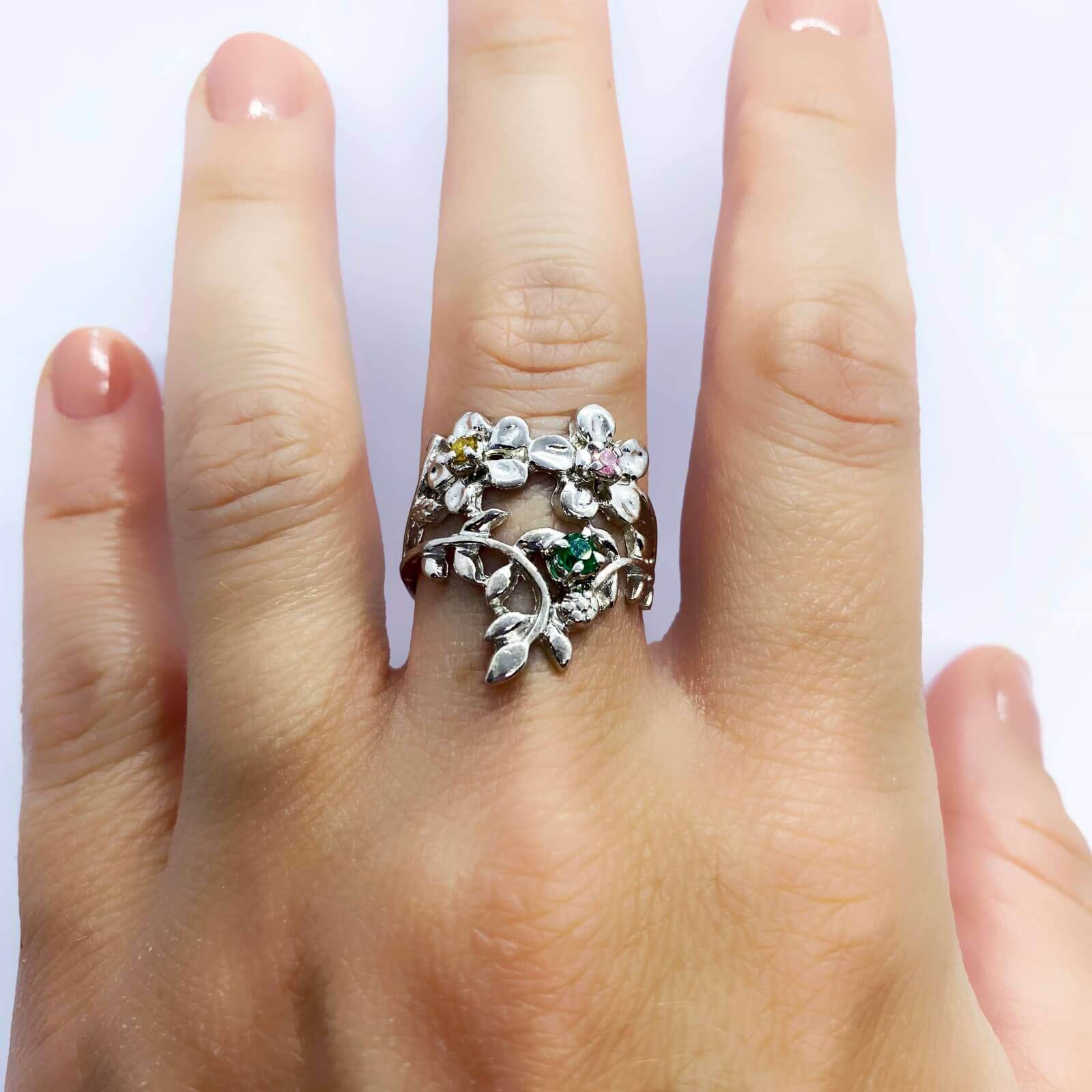 Anello argento 925 armonia floris short, con bagno galvanico di rodio in oro bianco; con tre pietre zirconia di colore verde, rosa e giallo, misura 14,5 (disponibile, su richiesta, in tutte le misure).