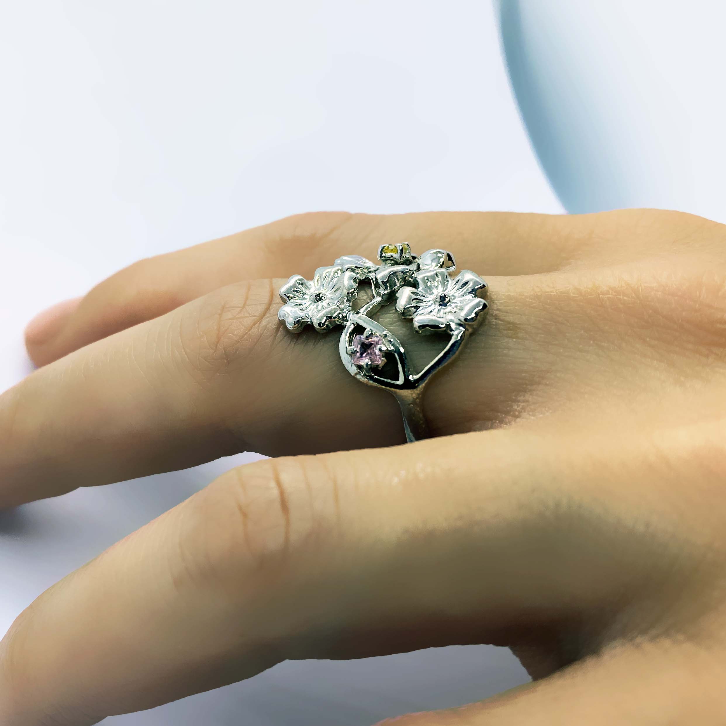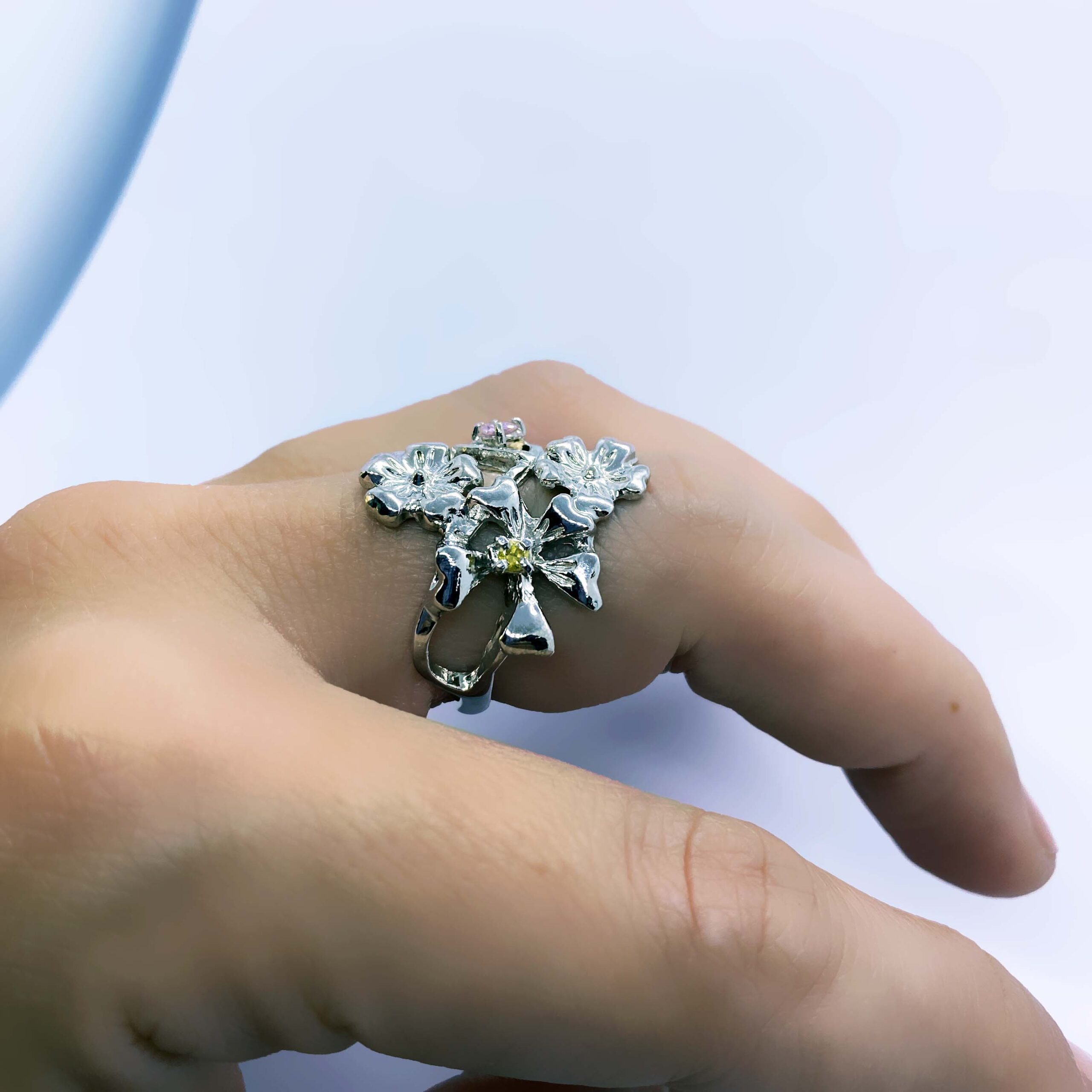 Anello fiori in argento 925, con bagno galvanico di rodio in oro bianco; con due pietre zirconia rosa e gialla, misura 14,5 (disponibile, su richiesta, in tutte le misure)