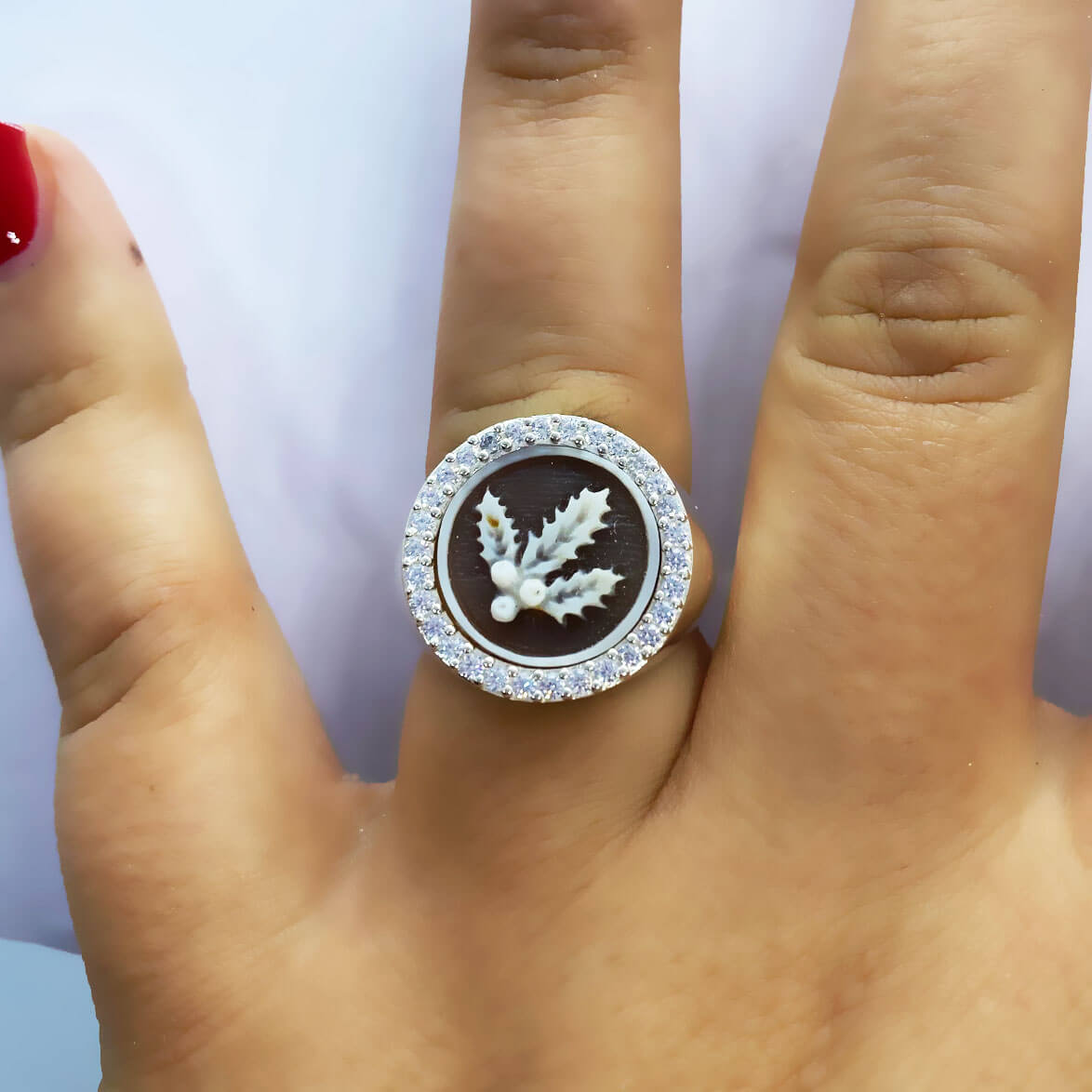 Anello in argento 925 realizzato con metodo della cera persa, con bagno galvanico di rodio in oro bianco, con cammeo sardonico di 14mm inciso a mano con tema natalizio e impreziosito con pietre zirconia. Misura regolabile.