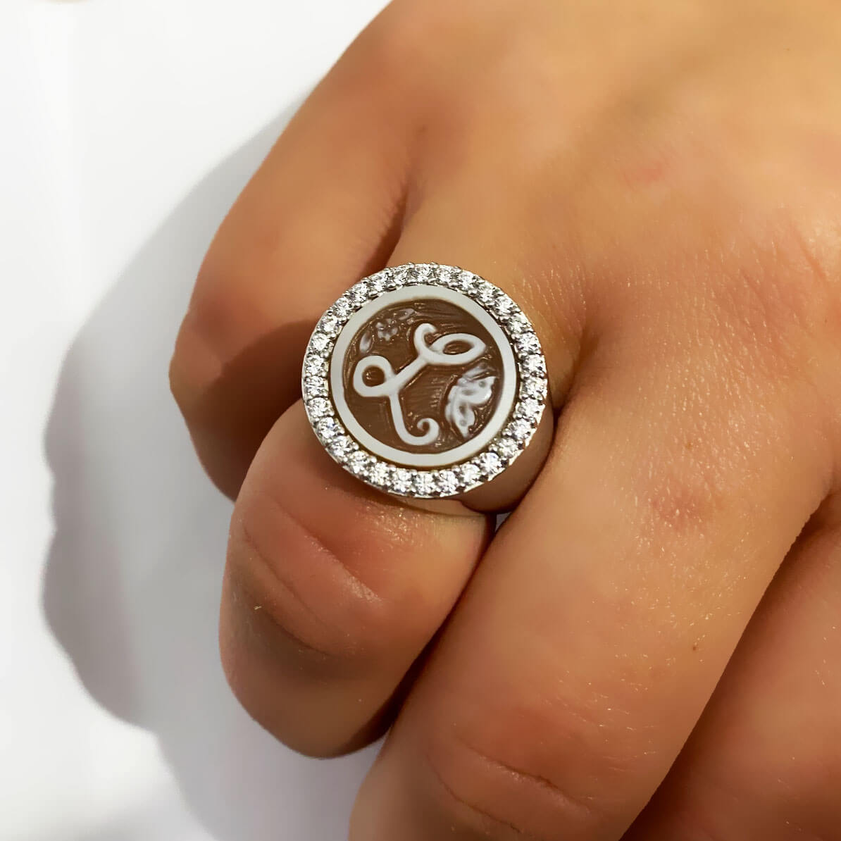 Anello in argento 925, realizzato con metodo della cera persa; con bagno galvanico di rodio in oro bianco; con cammeo sardonico di 14mm inciso a mano con lettera personalizzabile e impreziosito con pietre zirconia. Misura regolabile