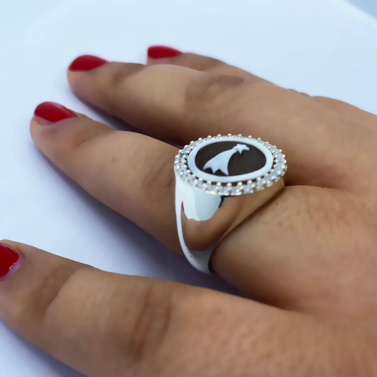 Anello in argento 925, realizzato con metodo della cera persa; con bagno galvanico di rodio in oro bianco; con cammeo sardonico di 14mm inciso a mano con tema natalizio e impreziosito con pietre zirconia. Misura regolabile