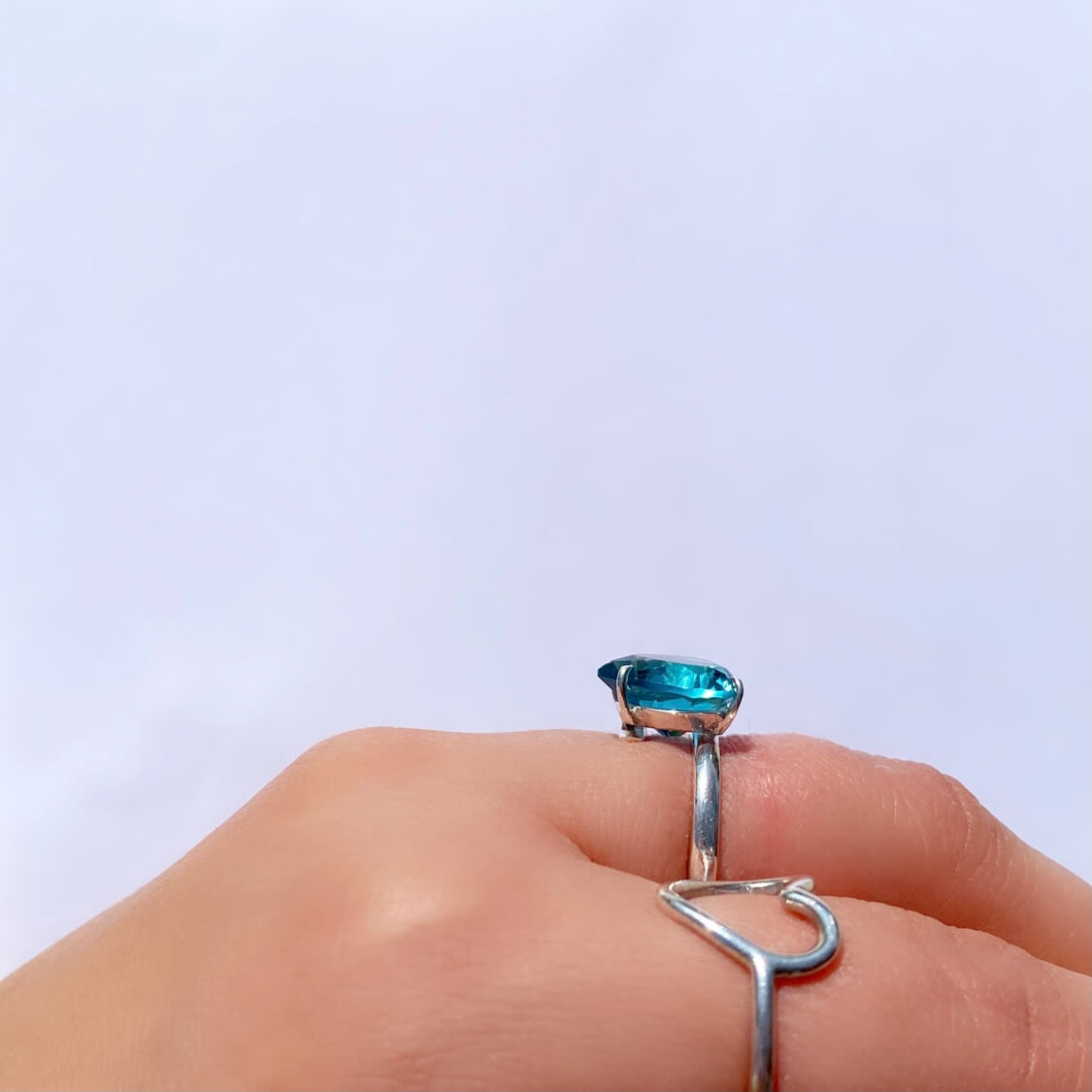 Anello Cuore dell’oceano in argento 925, con bagno galvanico di rodio in oro bianco e pietra zirconia a forma di cuore di colore azzurro.