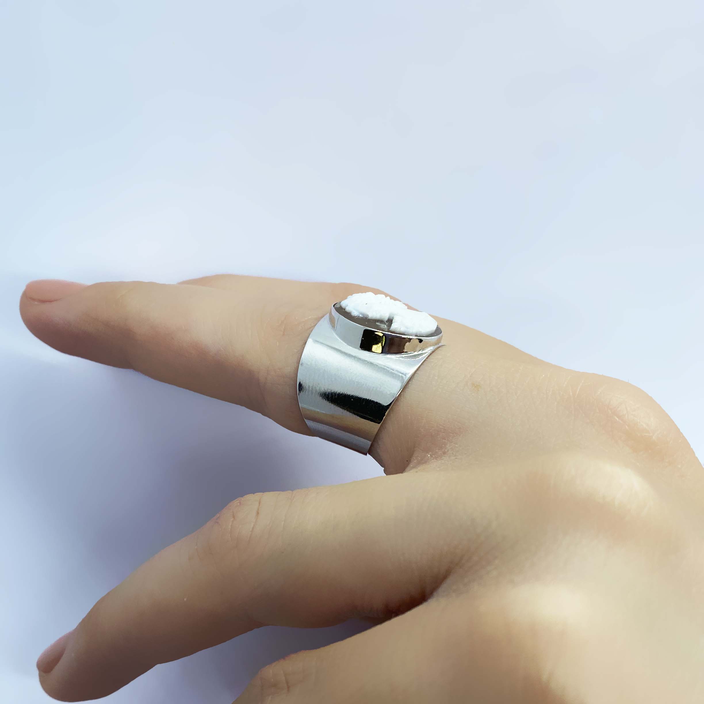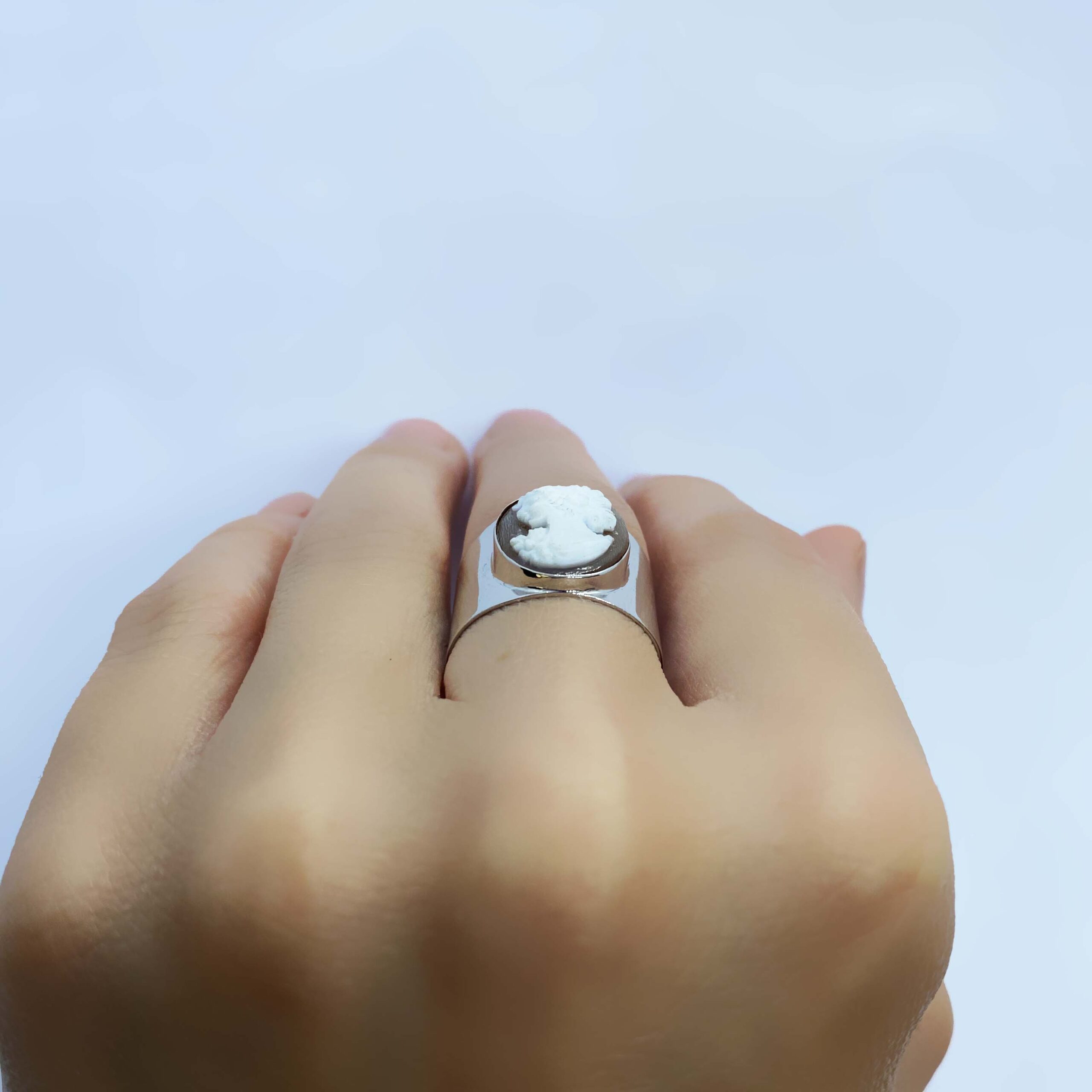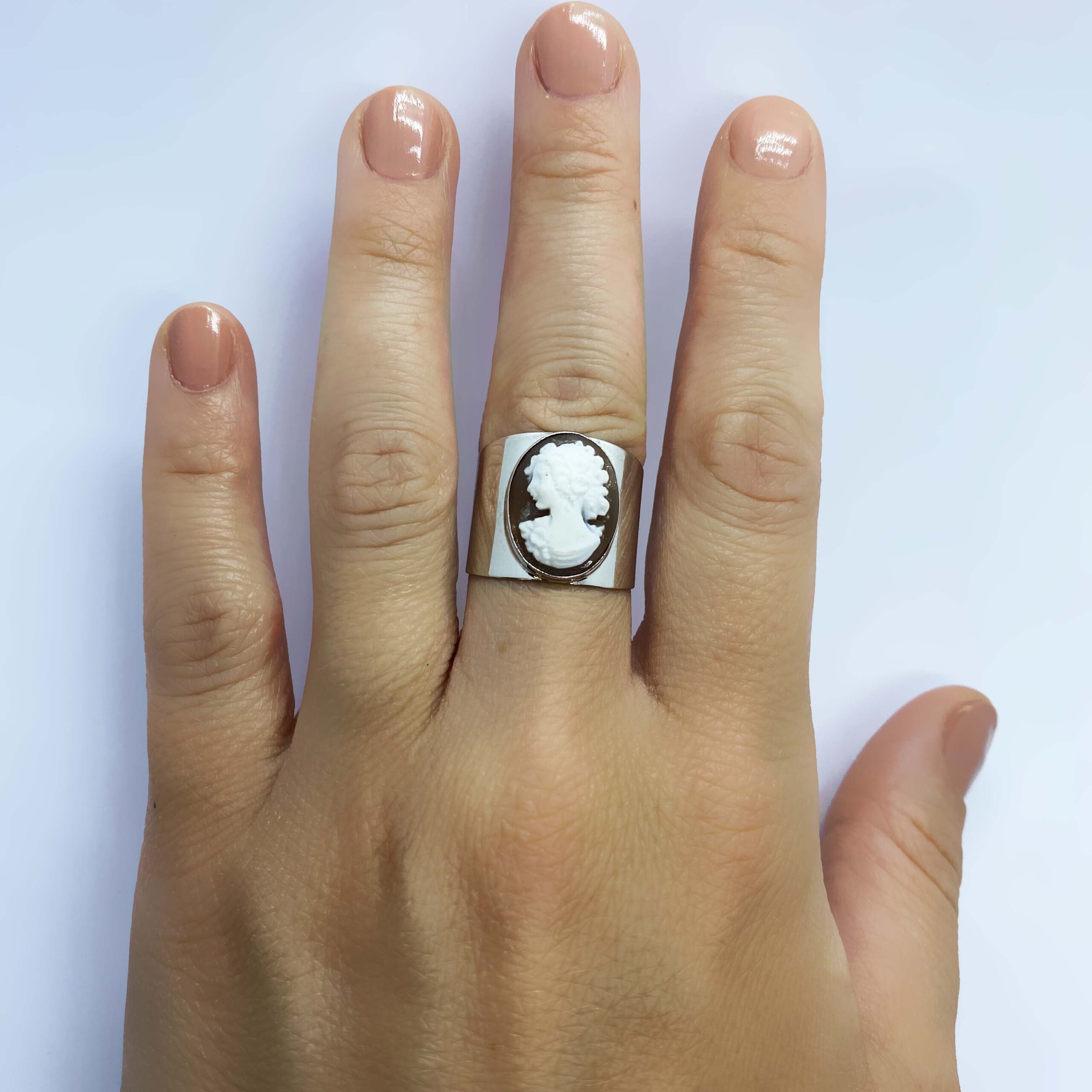 Anello fascia in argento 925, con bagno galvanico di rodio in oro bianco, con cammeo di conchiglia sardonica inciso a mano