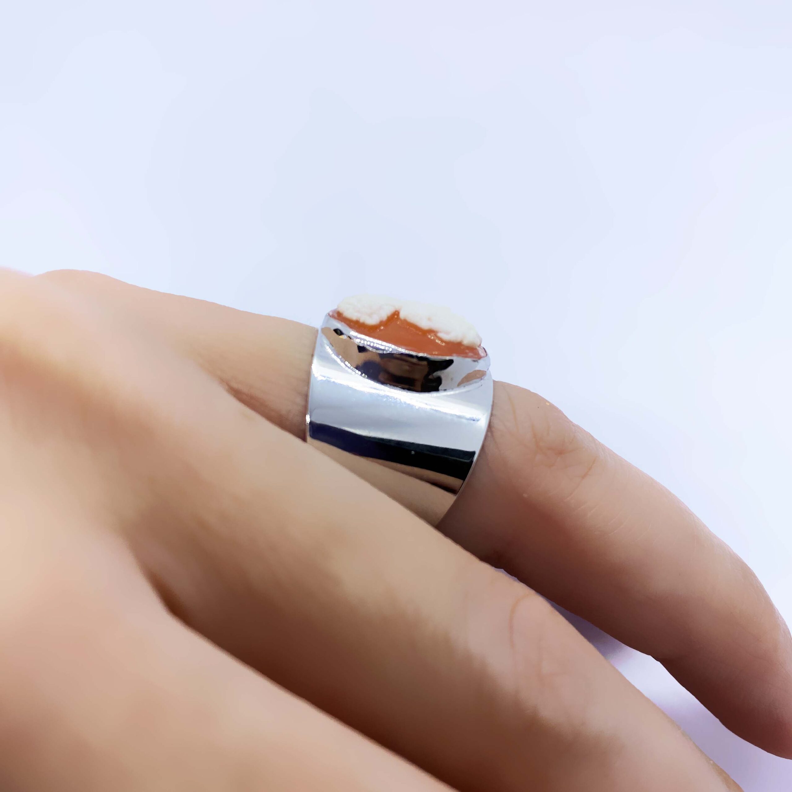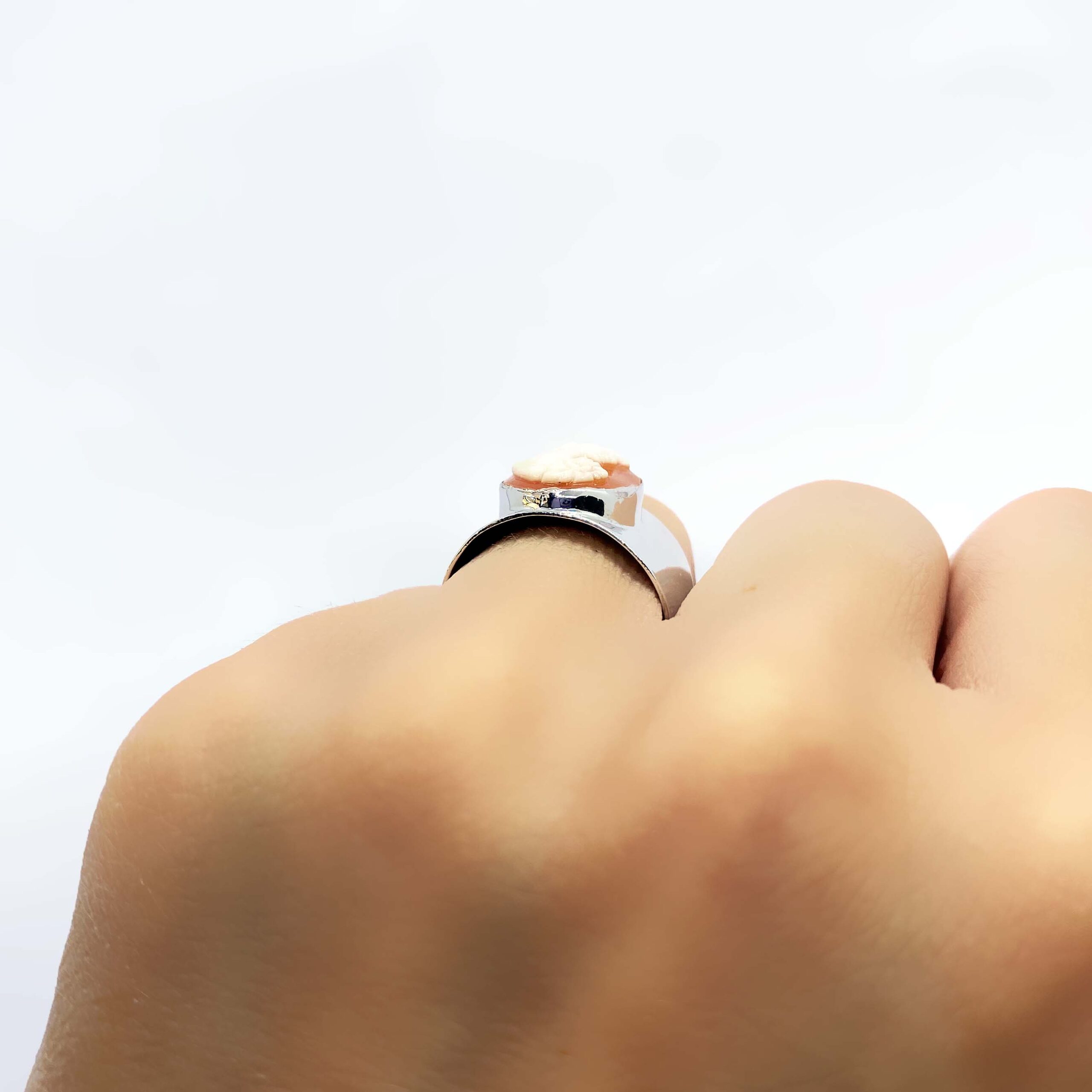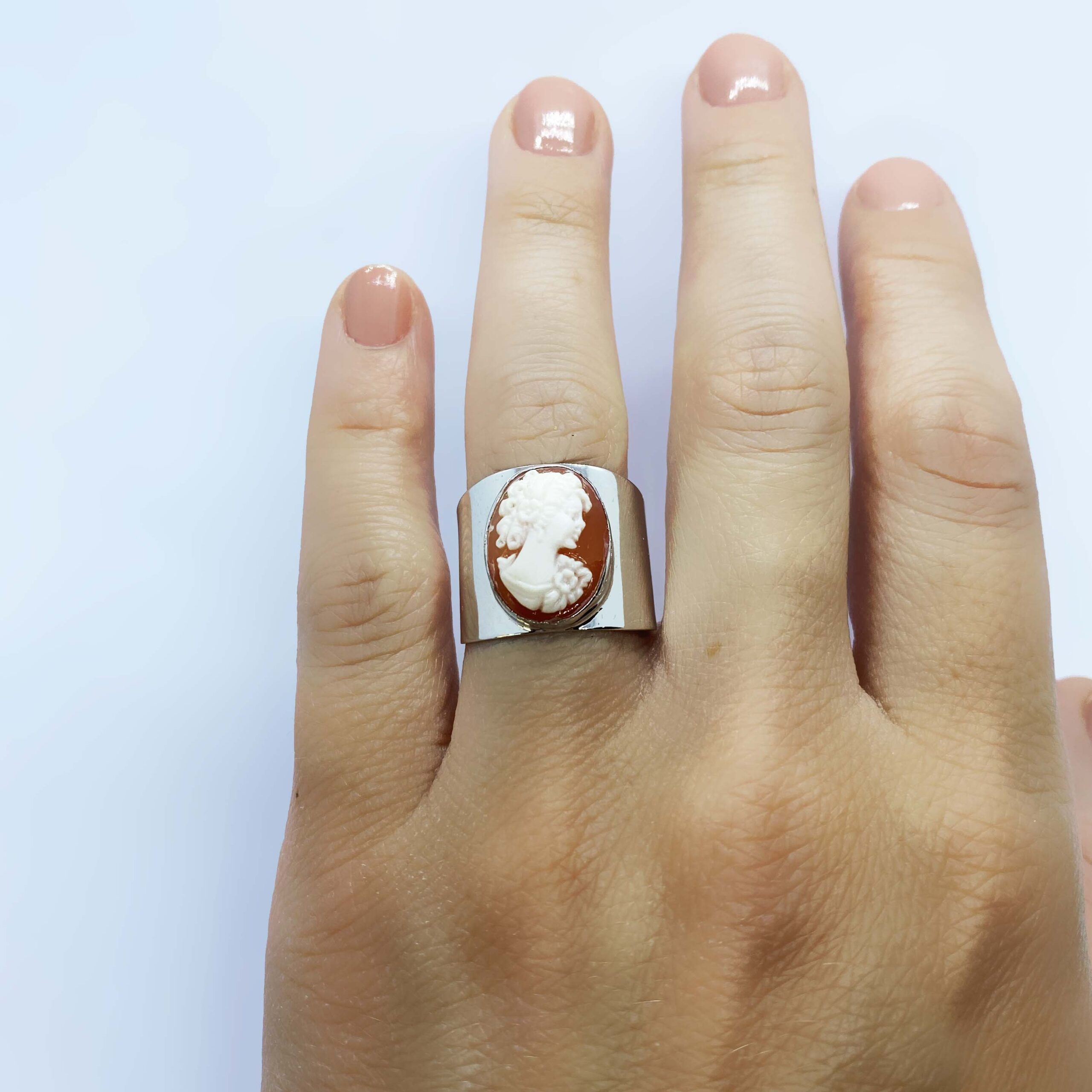 Anello – Fascia in argento 925, con bagno galvanico di rodio in oro bianco, con cammeo di conchiglia corniola inciso a mano, misura 17