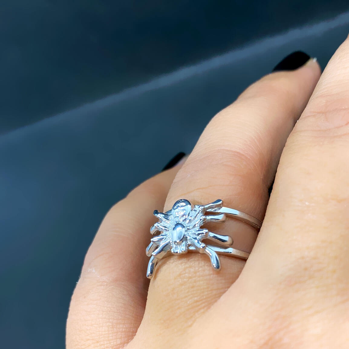 Anello con ragno in argento 925, con bagno galvanico di rodio in oro bianco, misura regolabile
