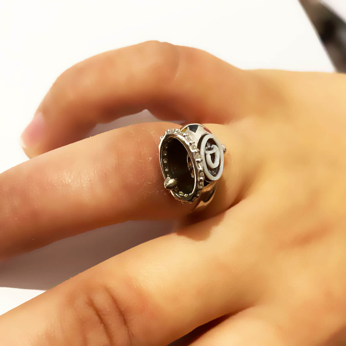 Anello shining bell in argento 925, con bagno galvanico di rodio in oro bianco. Con pietre zirconia e cammeo sardonico personalizzabile con lettera su richiesta.