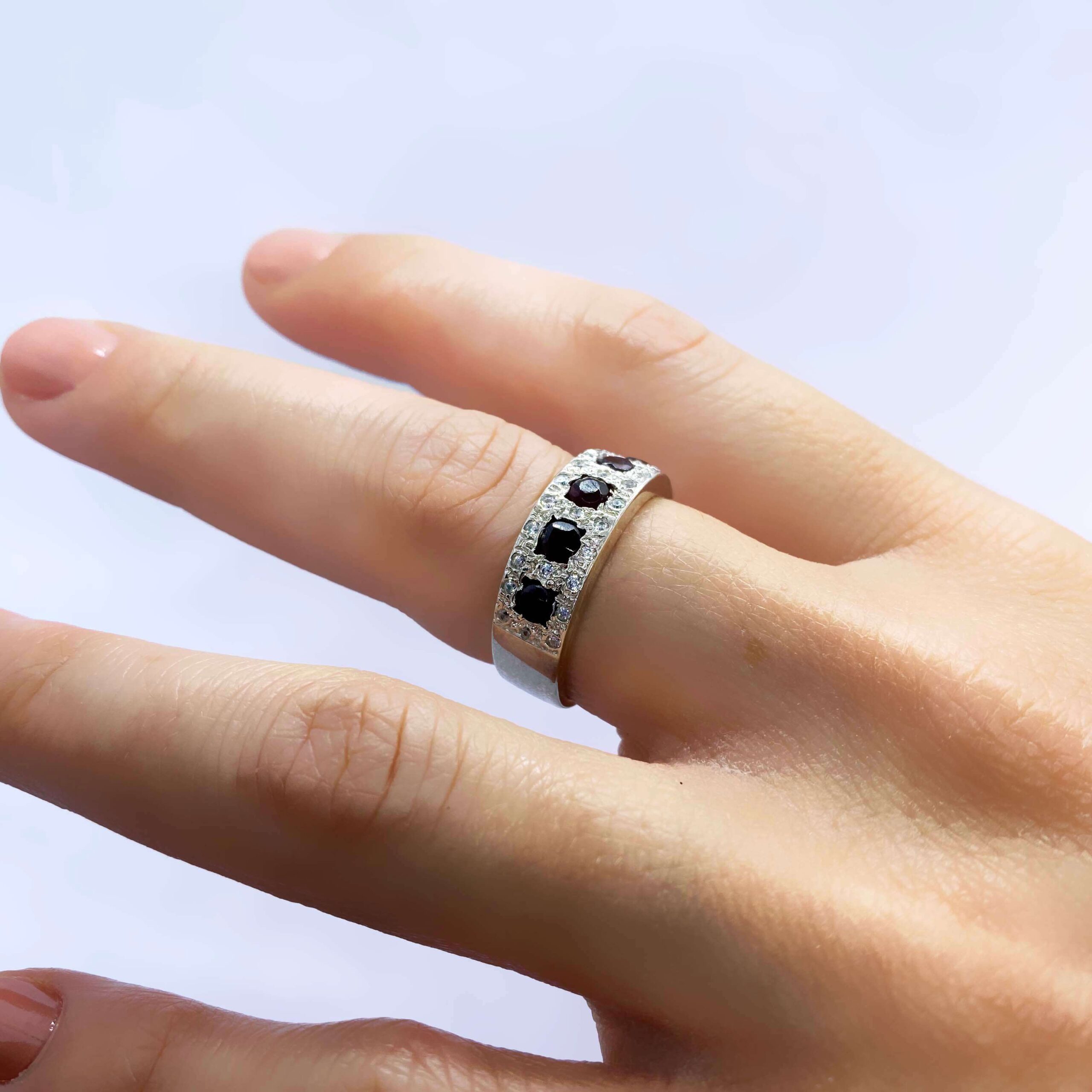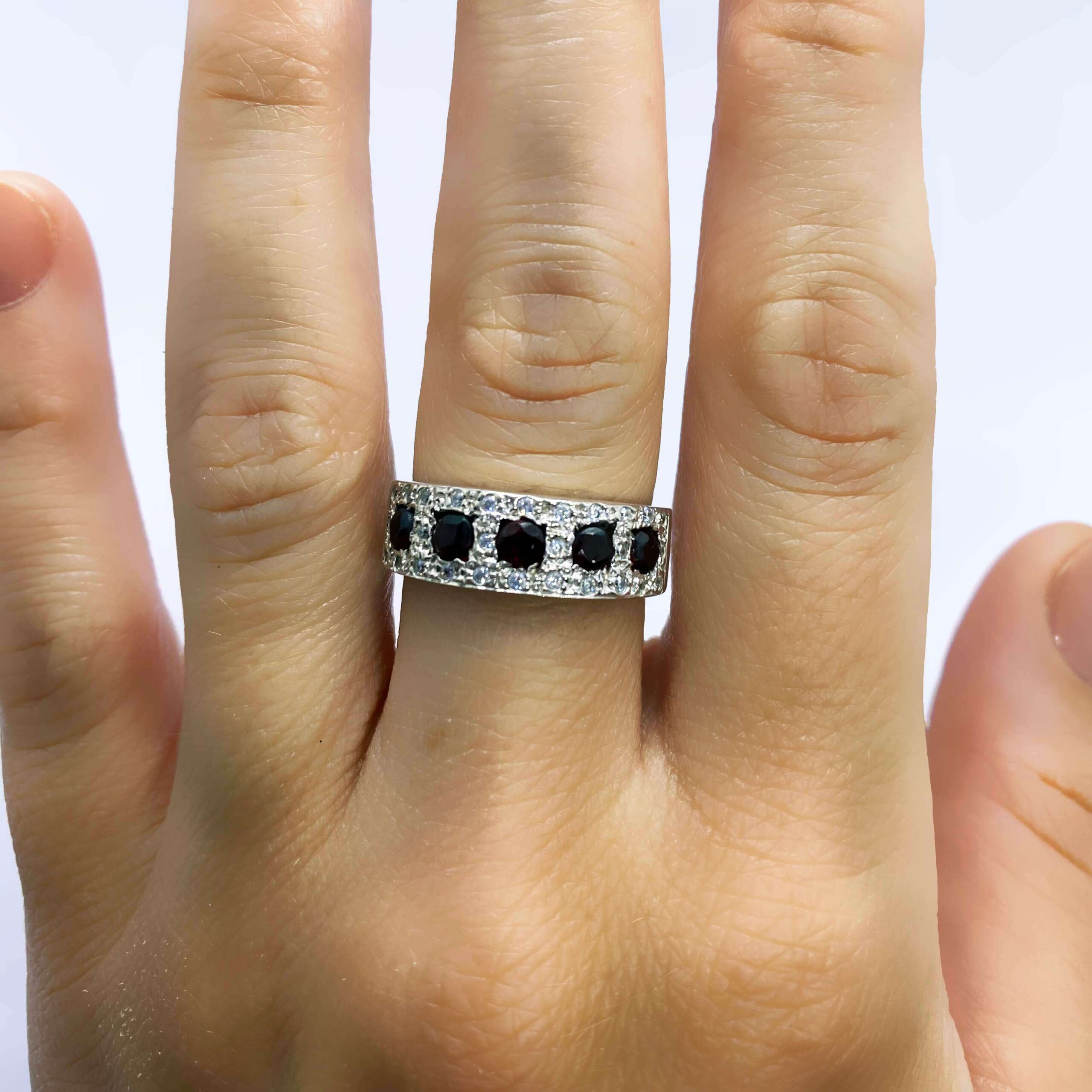 Anello tempesta bianca zirconia in argento 925, con bagno galvanico di rodio in oro bianco, con pietre “granato” e tempesta di zirconi colore bianco; incastonati con metodo bulino