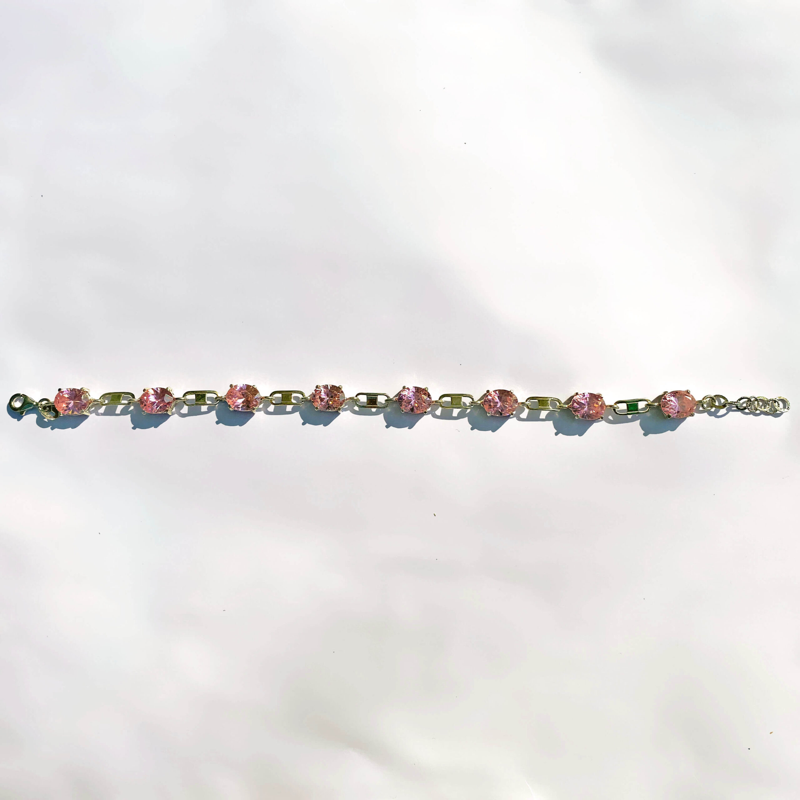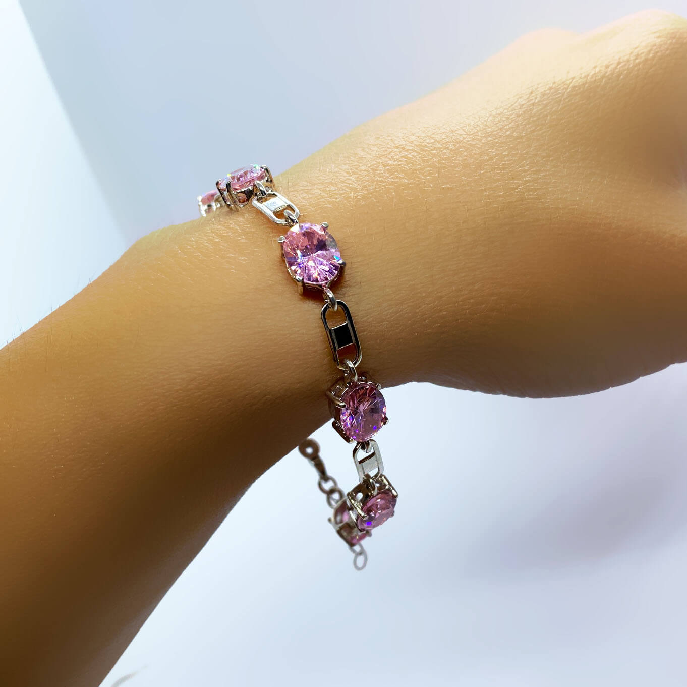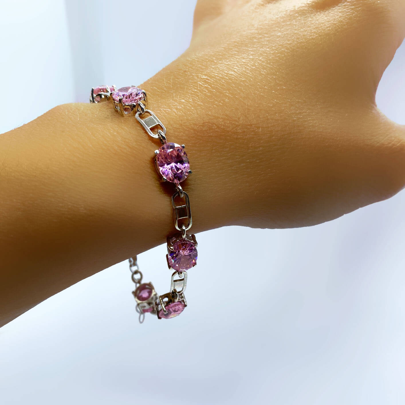 Bracciale in argento 925, con bagno galvanico di rodio in oro bianco, con 8 Zirconi rosa 6×8 mm, lunghezza 18.5 cm (allungabile)