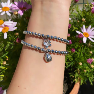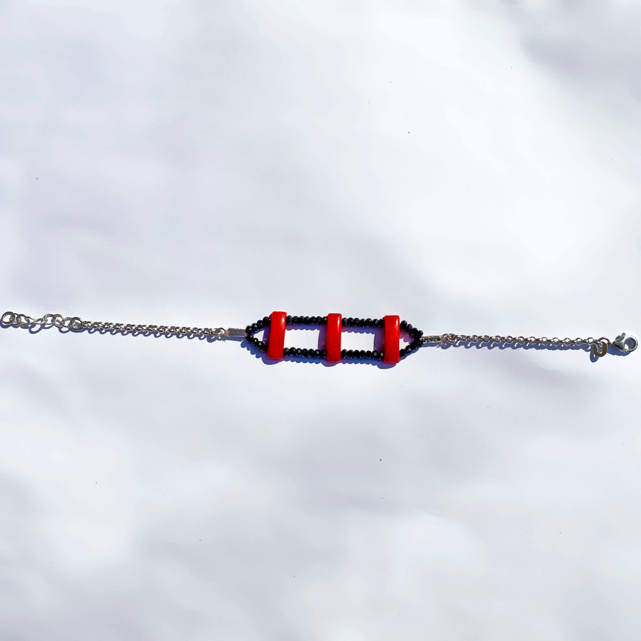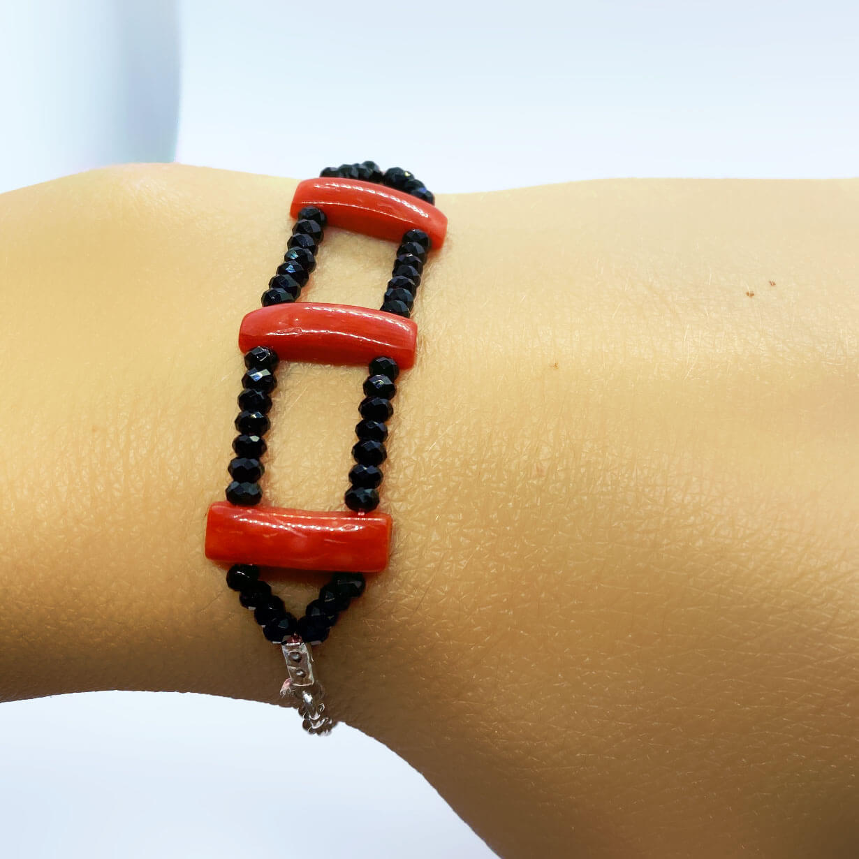 Bracciale in corallo naturale e onice nera, con chiusura in argento 925 con bagno galvanico di rodio in oro bianco, lunghezza 19 cm.
