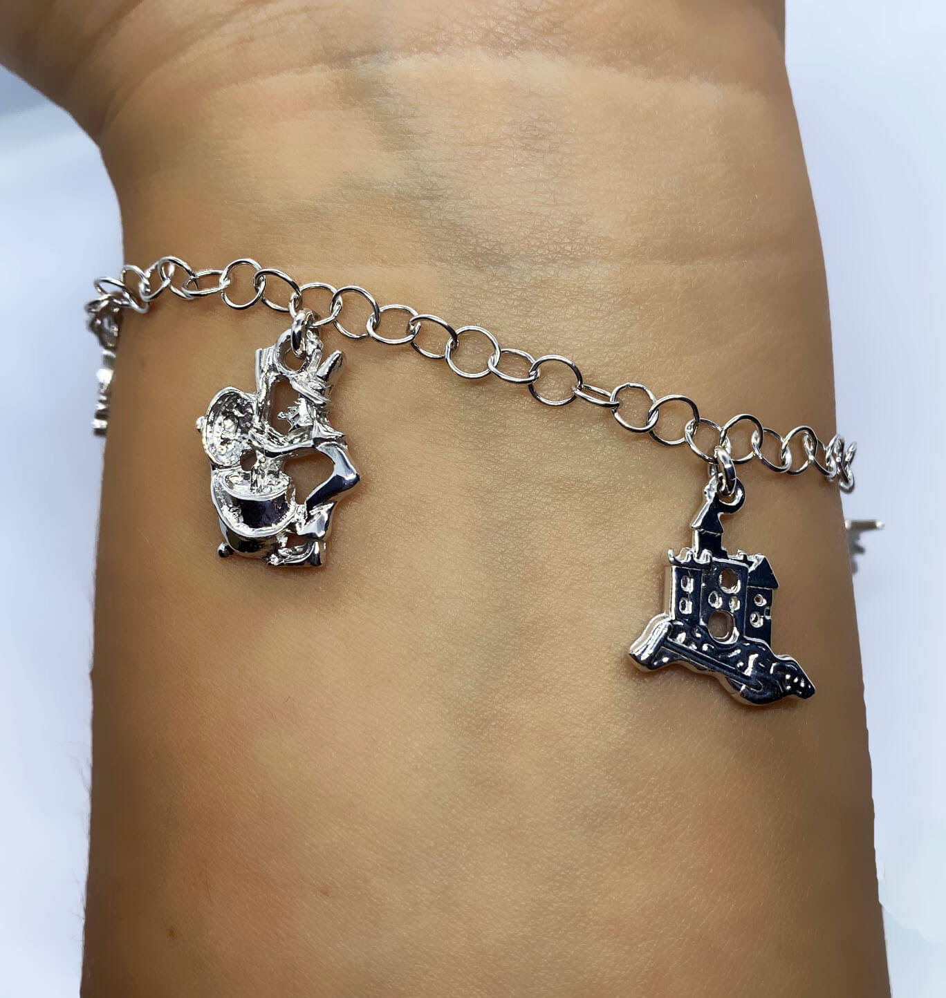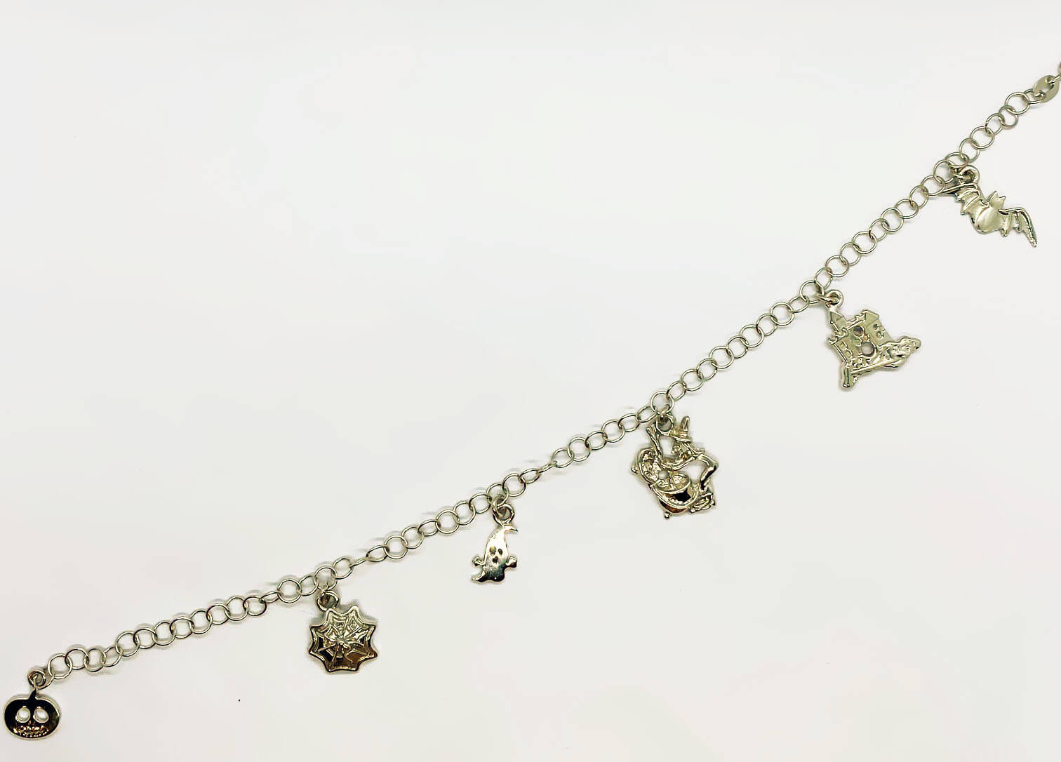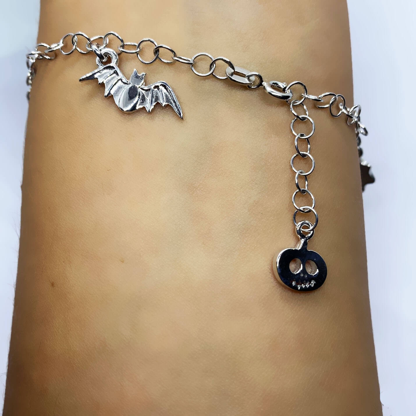 Bracciale Spooky e pendenti a tema in argento 925, con bagno galvanico di rodio in oro bianco(lunghezza regolabile).