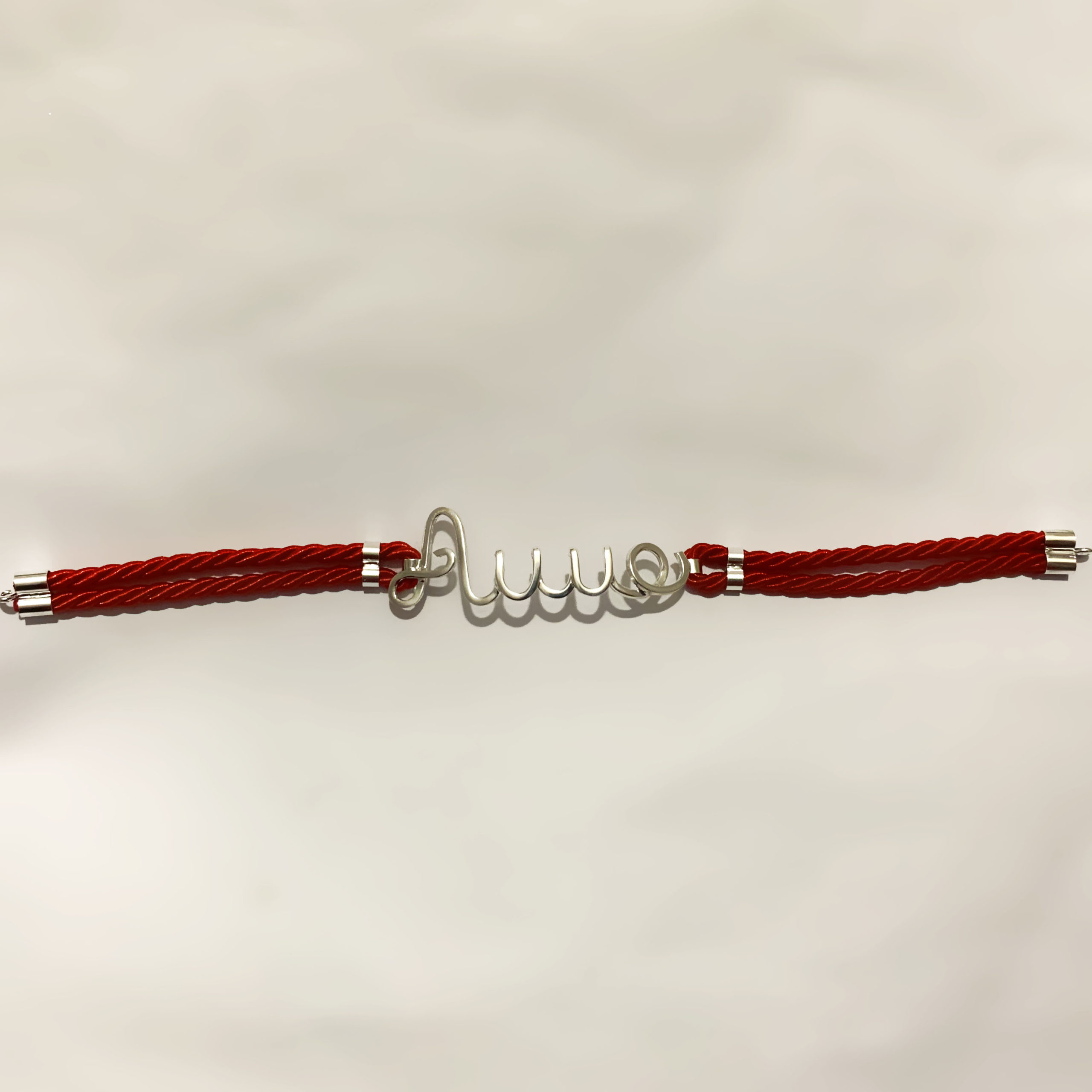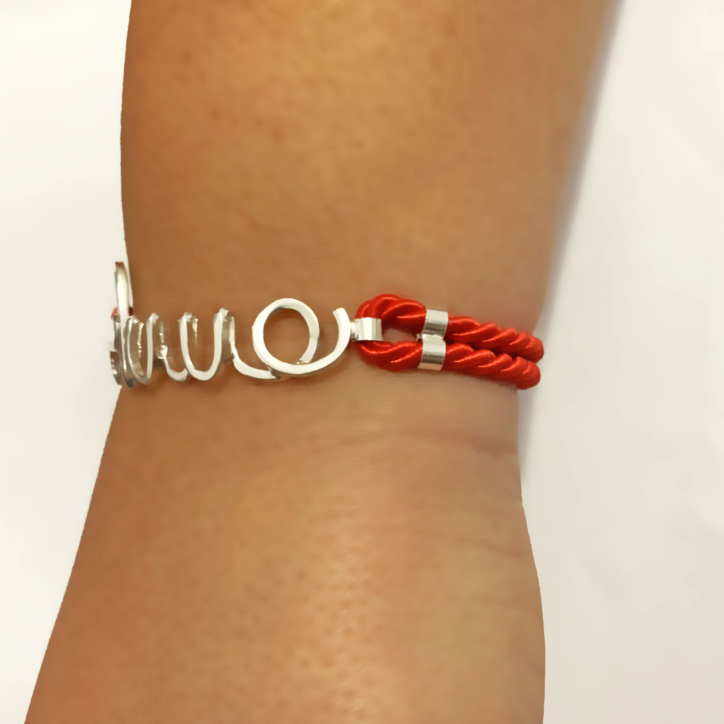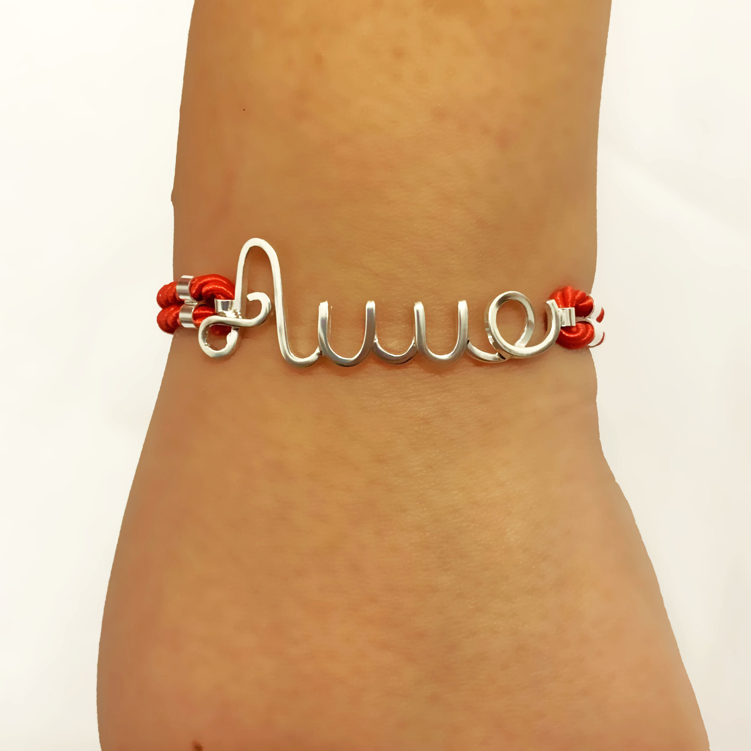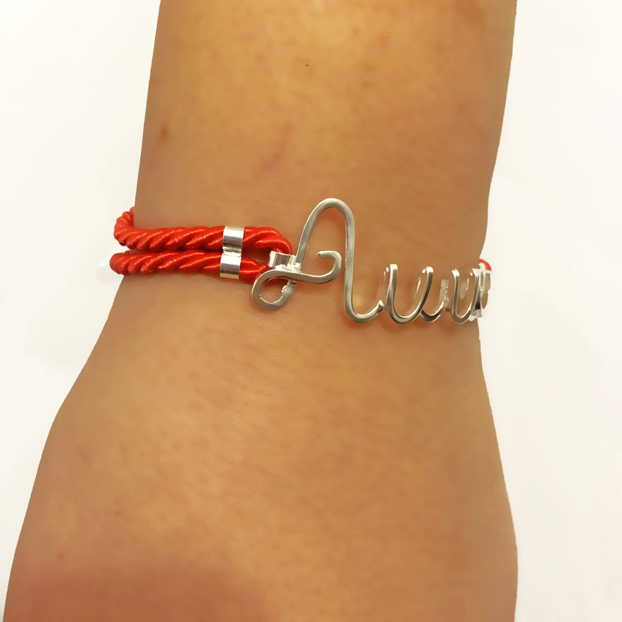 Bracciale realizzato a mano con filo d’argento 925 e cordoncino intrecciato; disponibile con bagno galvanico in oro bianco, oro giallo, oro rosa. Cordoncino disponibile rosso o nero. Personalizzabile con parole e nomi a scelta.