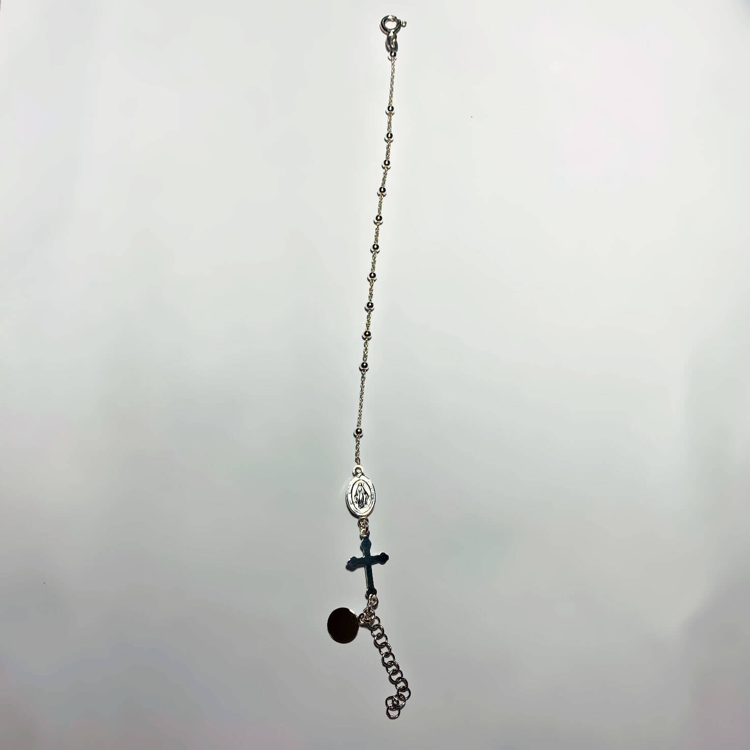 Bracciale Preghiera in argento 925, con bagno galvanico di rodio in oro bianco. Con medaglietta personalizzabile con lettera. Disponibile anche con bagno di oro rosa e bagno di oro giallo.