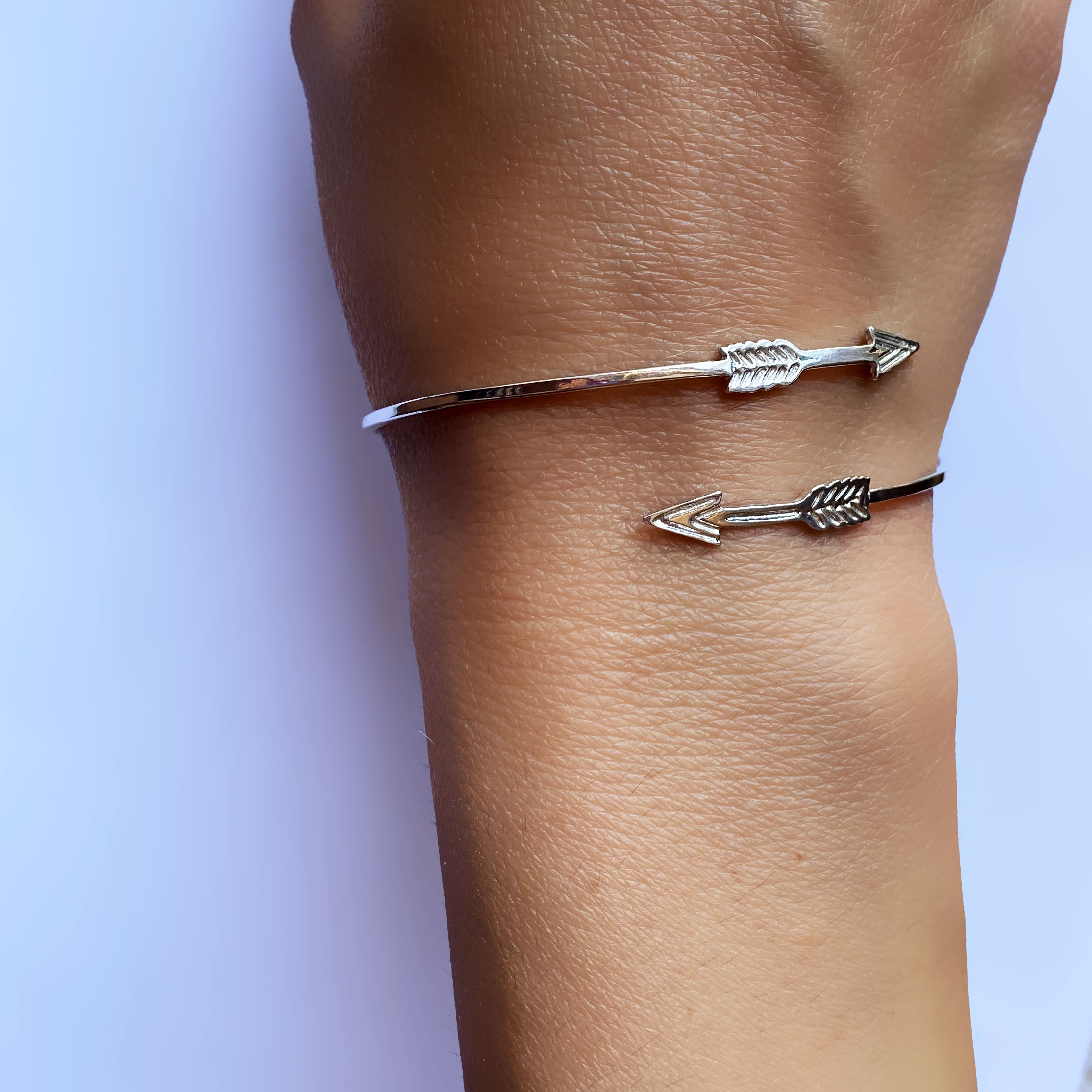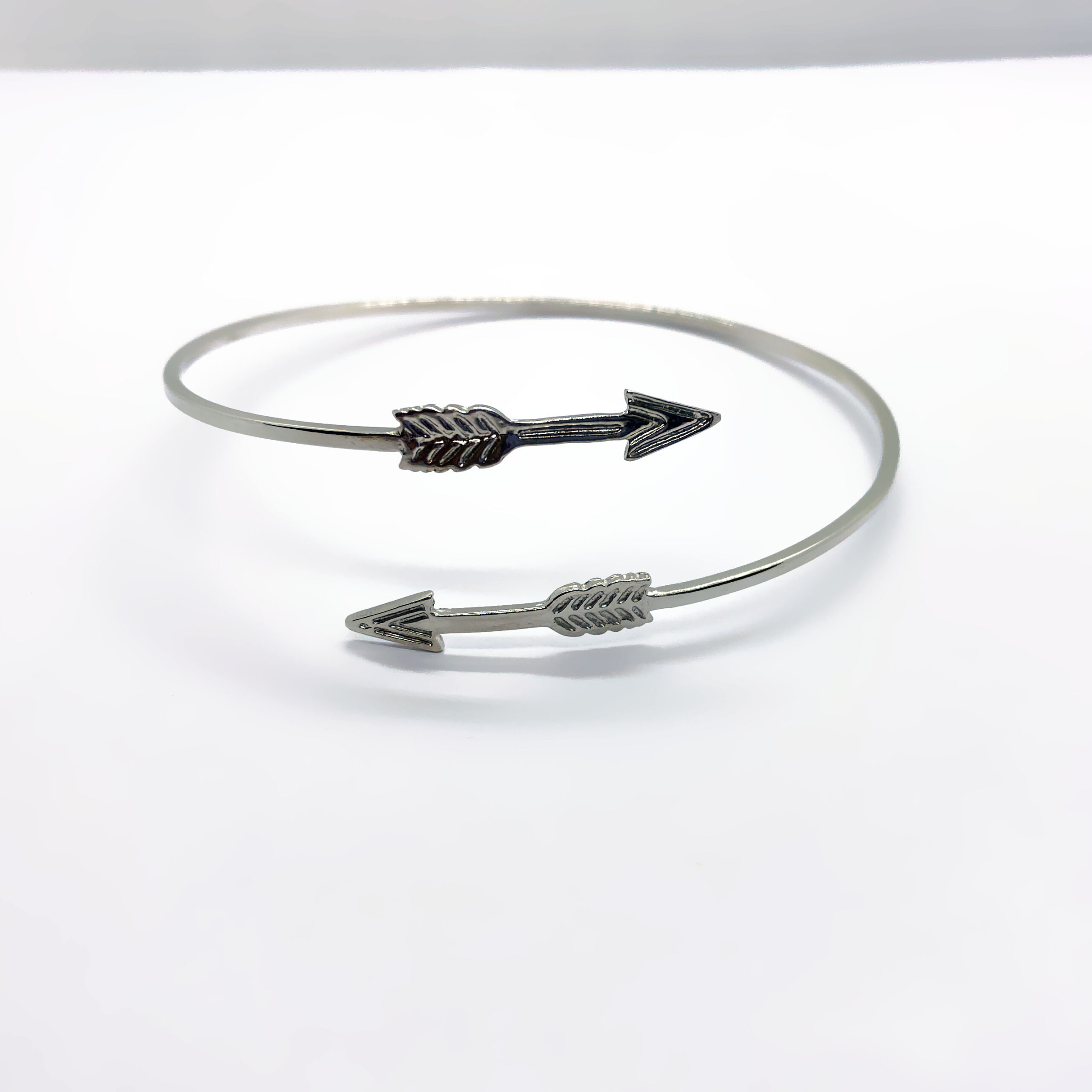 Bracciale rigido “frecce” variante in argento 925, con bagno galvanico di rodio in oro bianco, misura regolabile.