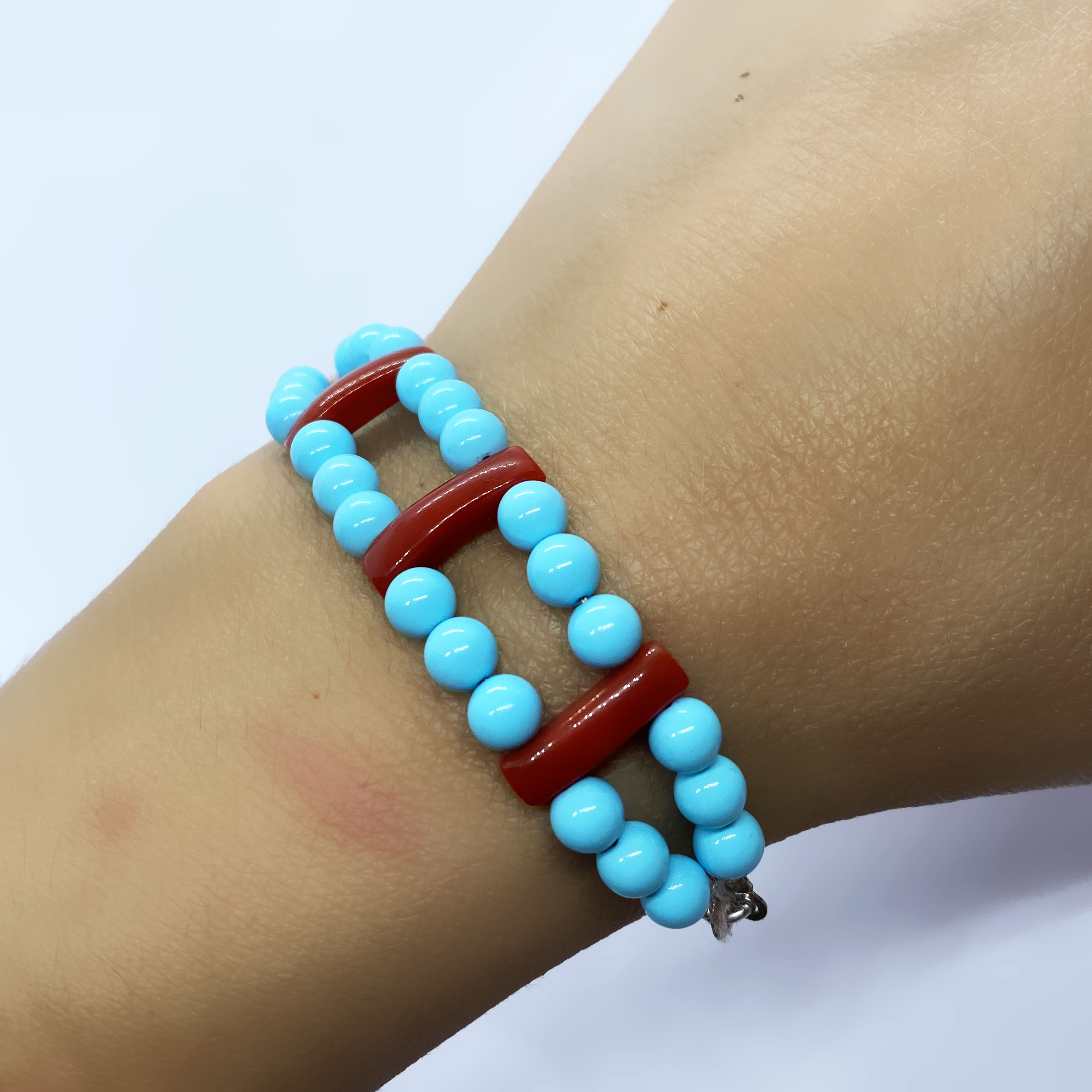 Bracciale in corallo e turchese, con chiusura in argento 925 e bagno galvanico di rodio in oro bianco, lunghezza 17,5 cm