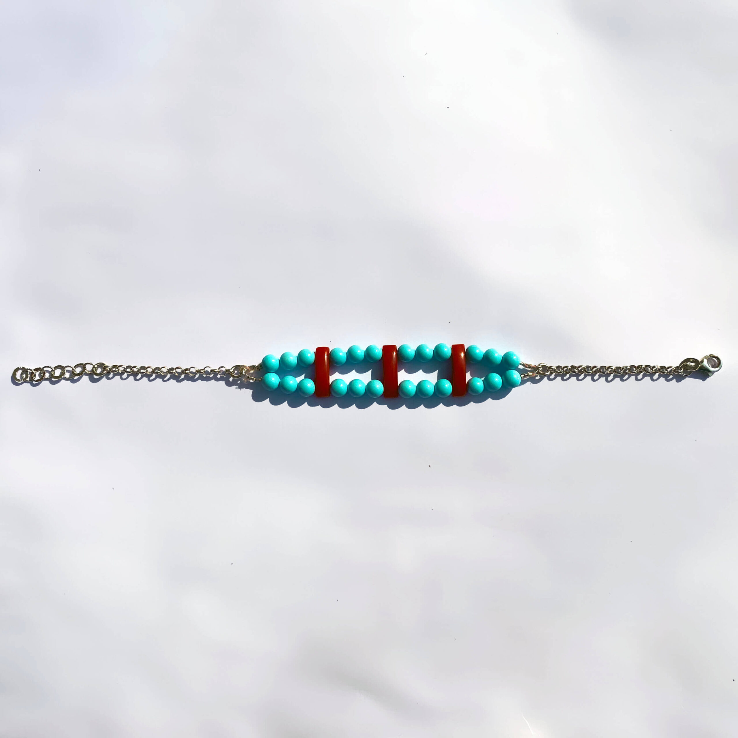Bracciale in corallo naturale e pasta di turchese, con chiusura in argento 925 e bagno galvanico di rodio in oro bianco, lunghezza 17,5 cm (allungabile).