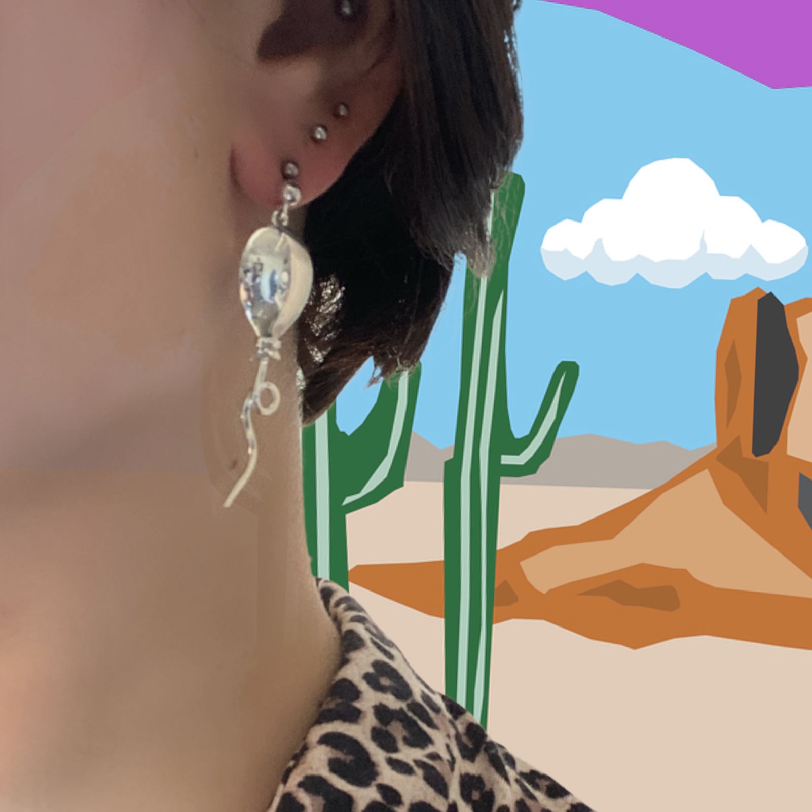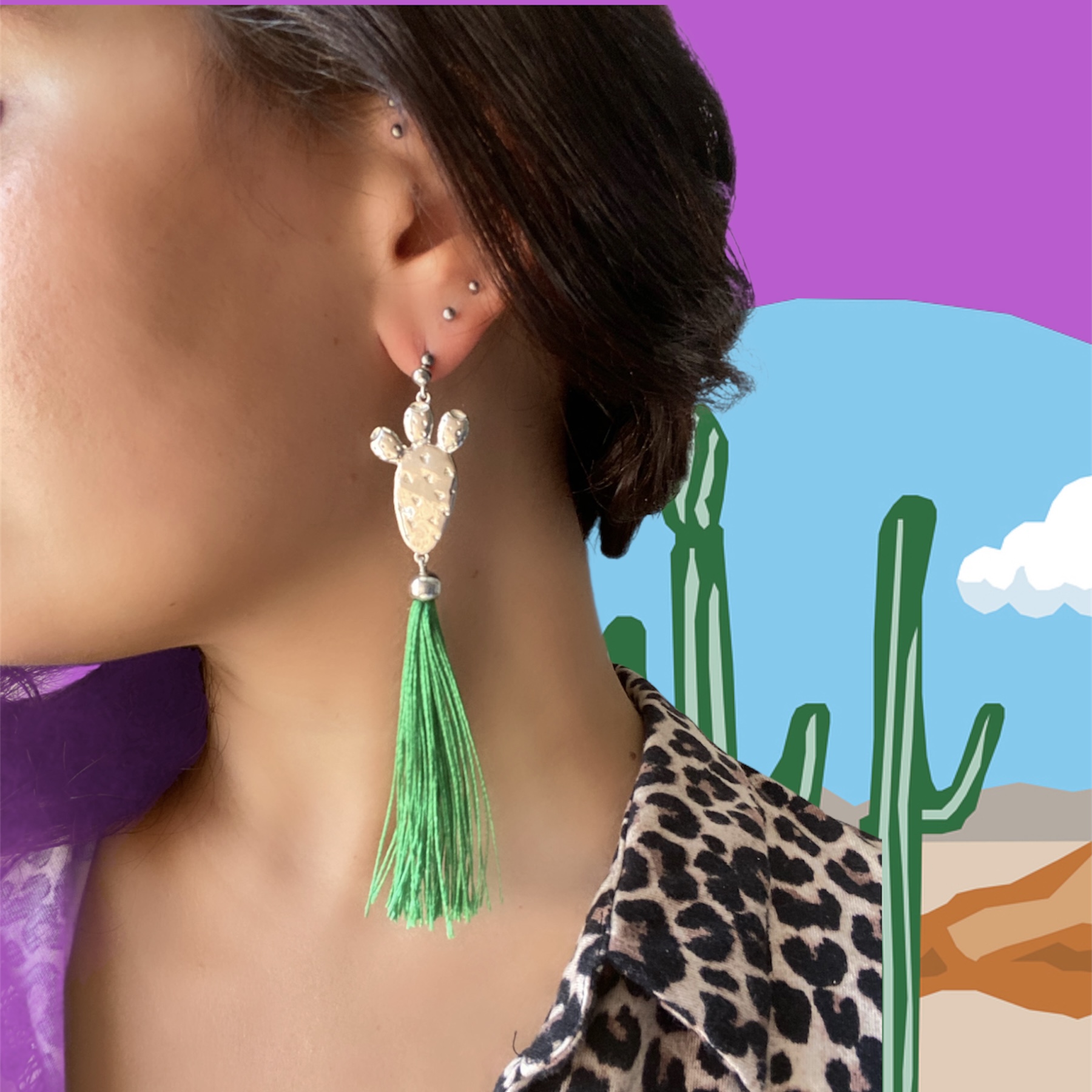 Una favola trasformata in gioiello: cactus e palloncino, meticolosamente realizzati a mano, in argento 925 e bagno di rodio in oro bianco, e nappina in tessuto verde!