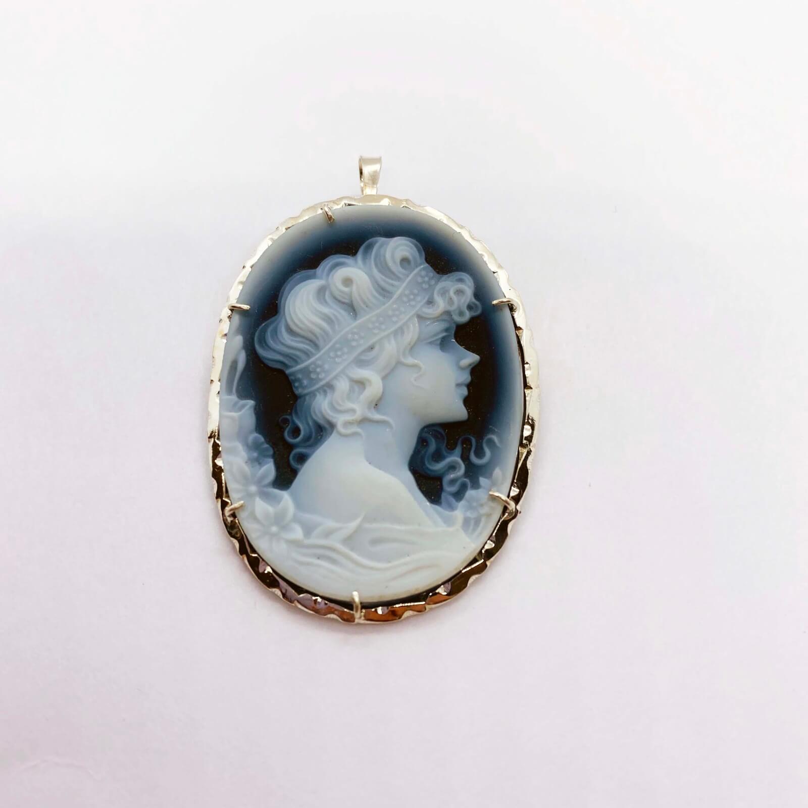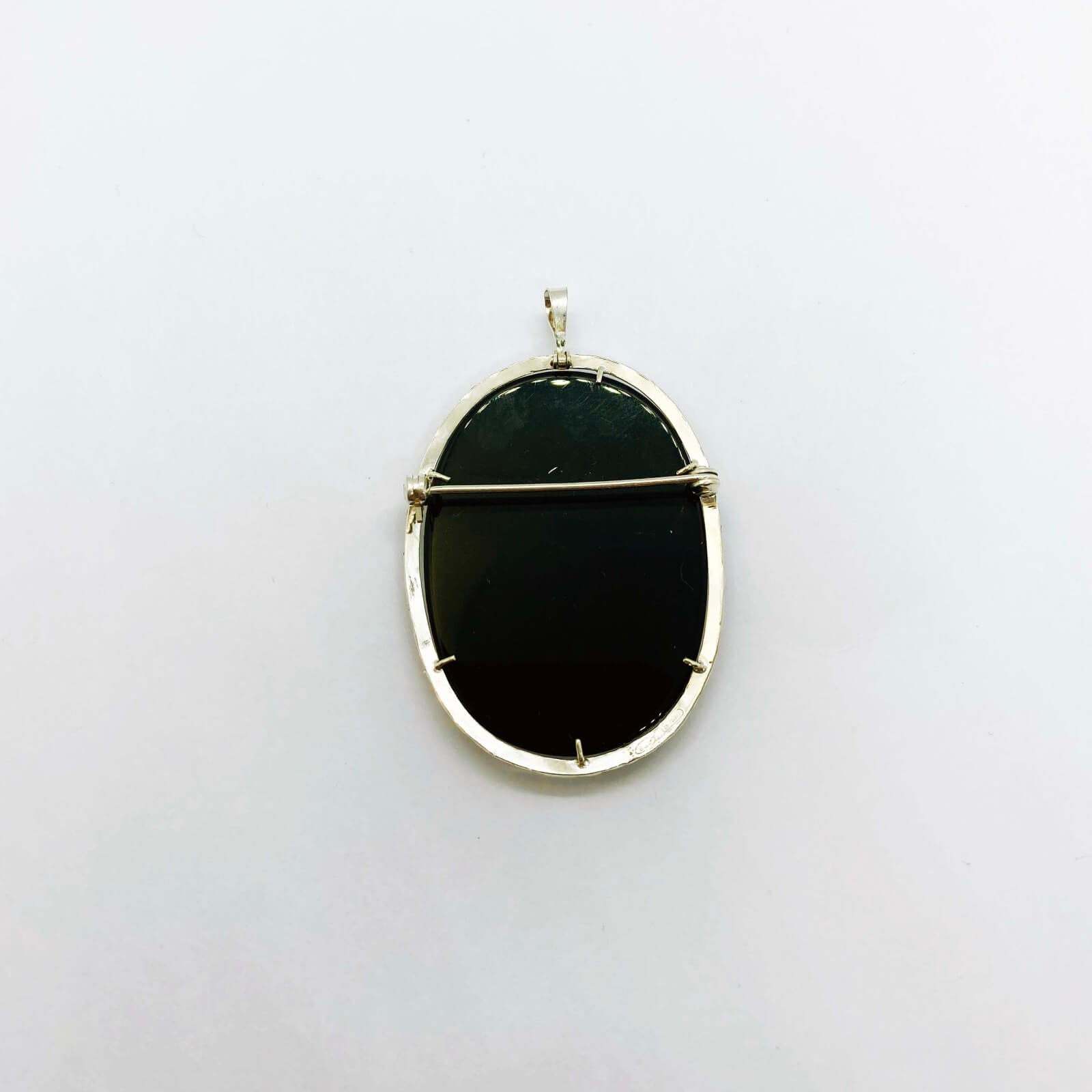 Cammeo Ciondolo – Spilla Argento in argento 925, con bagno galvanico di rodio in oro bianco, con cammeo in agata nero notte 40 mm.