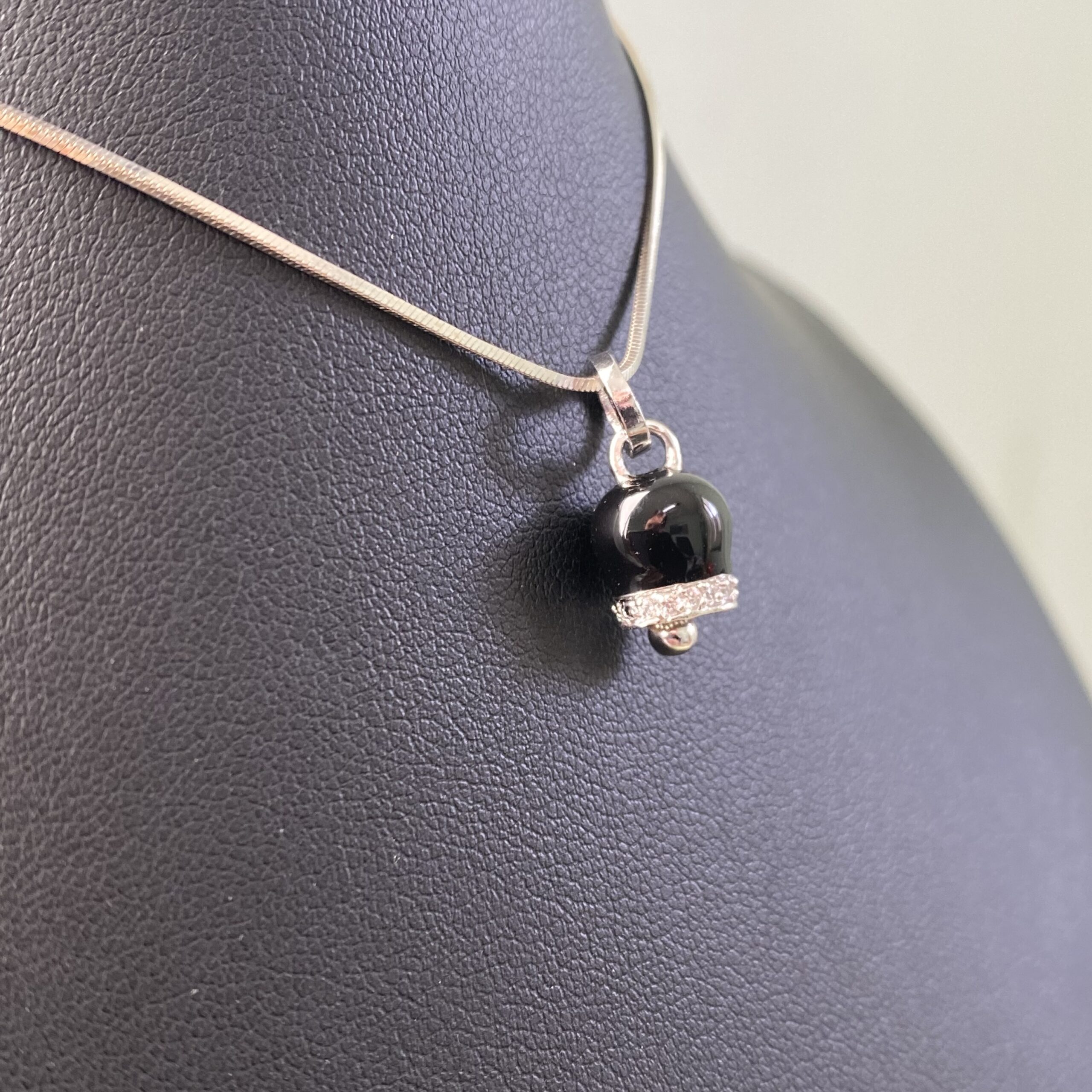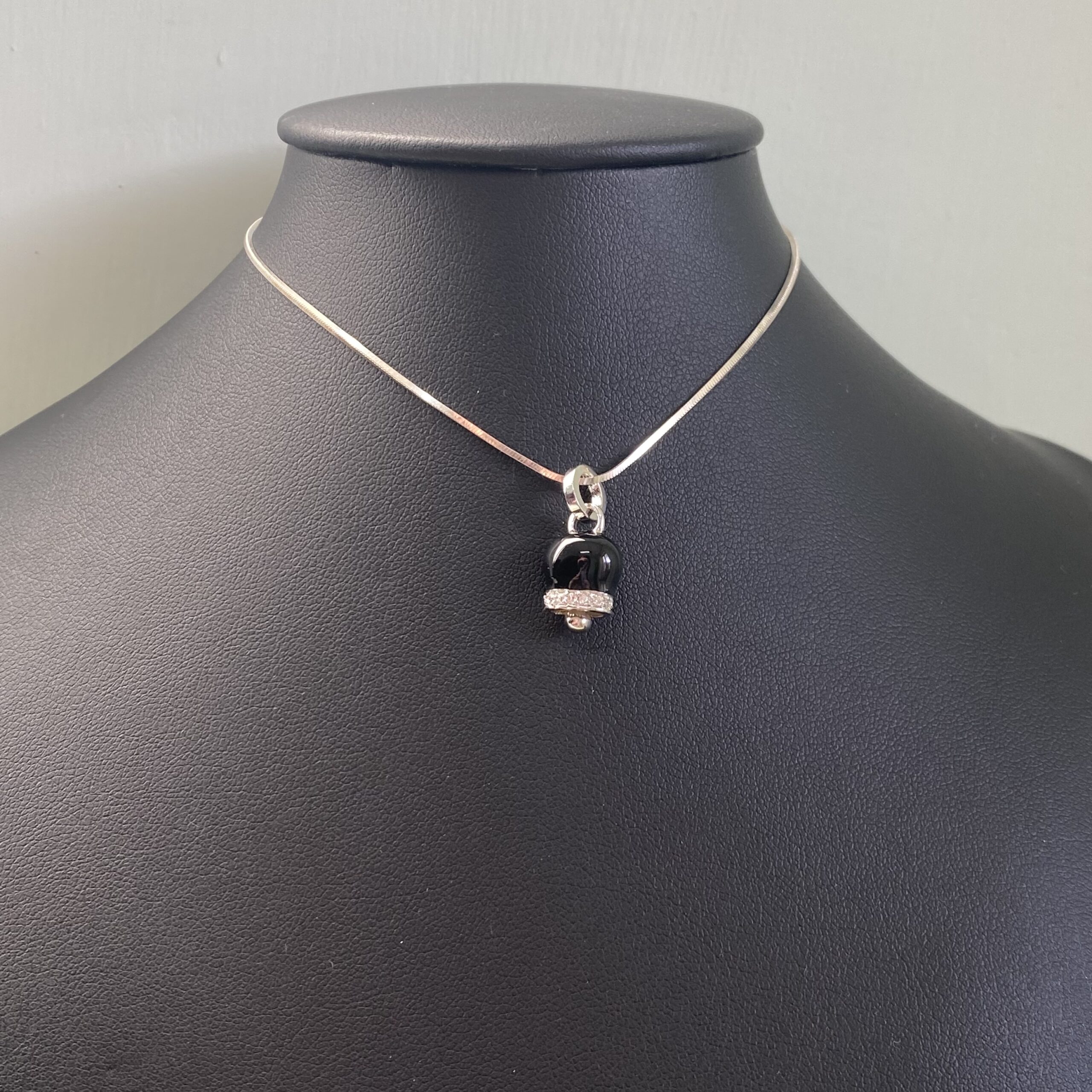 Elegantissima Campanellina smaltata nera, realizzata in argento 925 e pietre zirconia; catenina veneziana in argento 925 omaggio