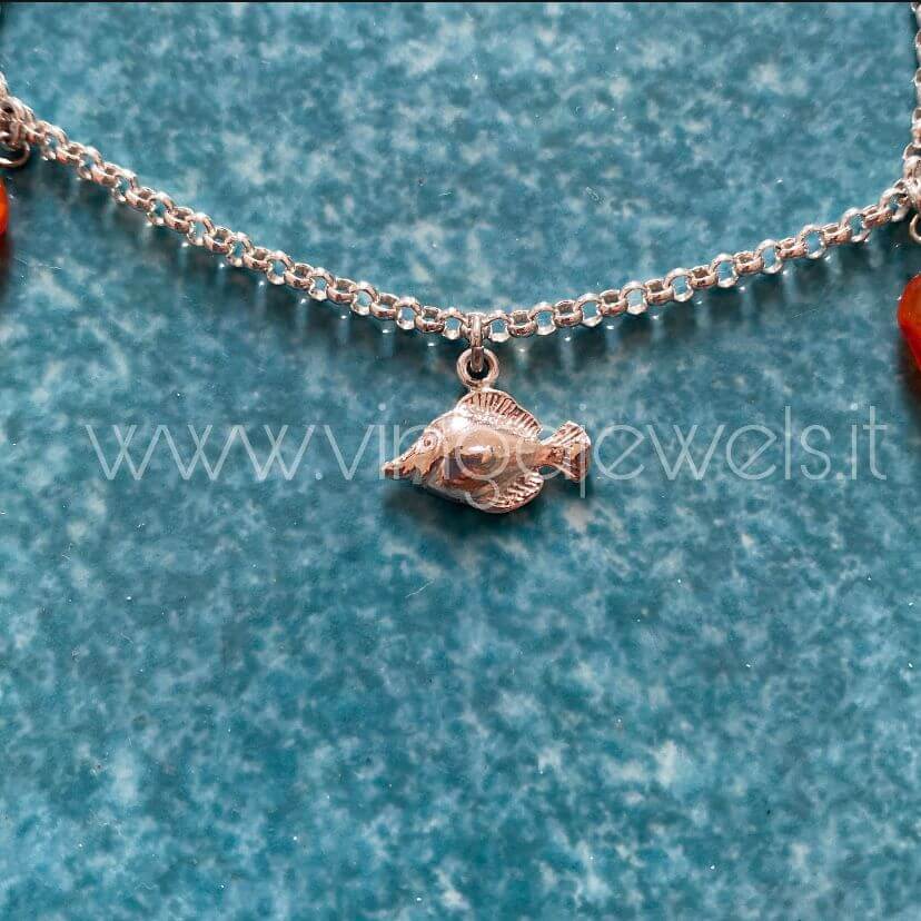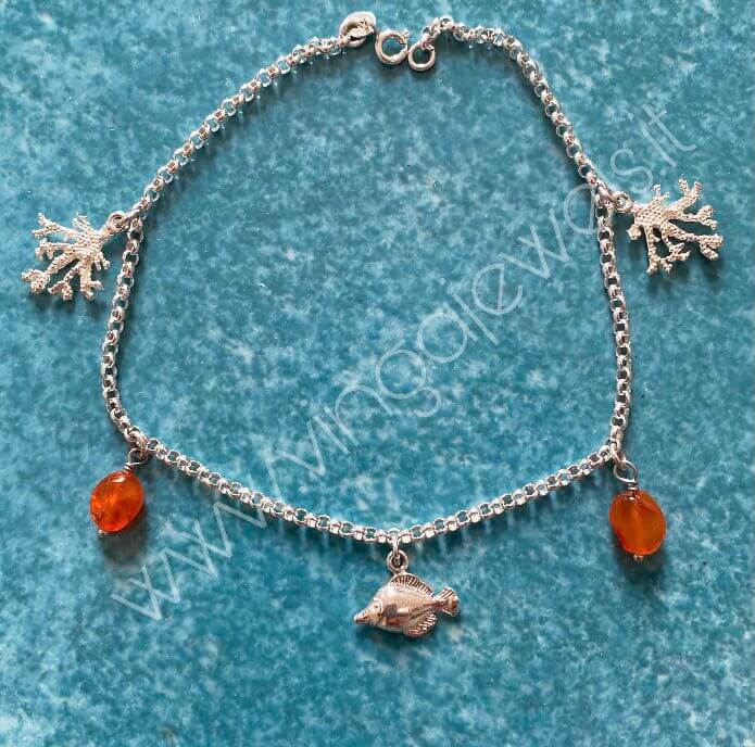 Cavigliera con motivi marini in argento 925 e bagno di rodio in oro bianco e gocce di corniola naturale