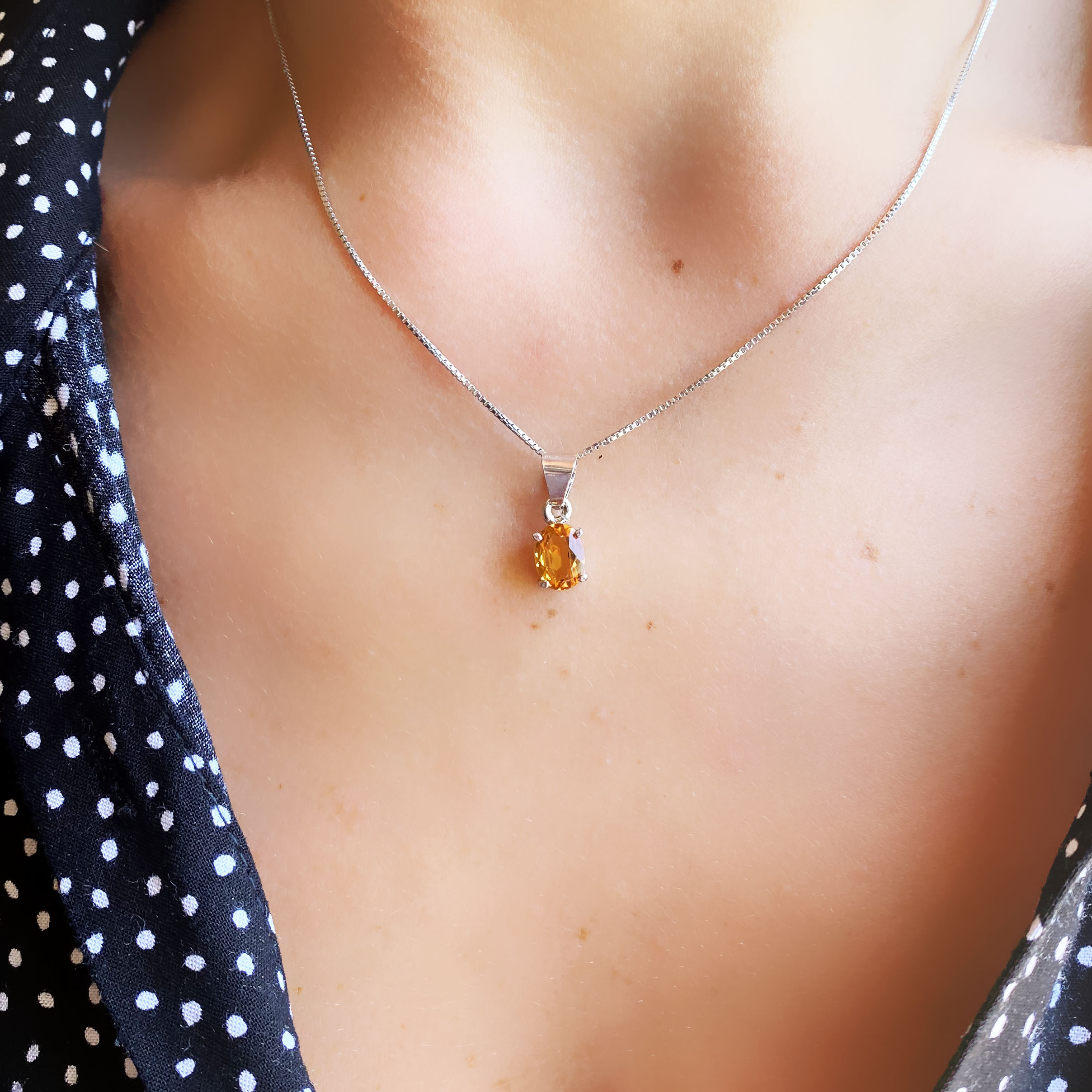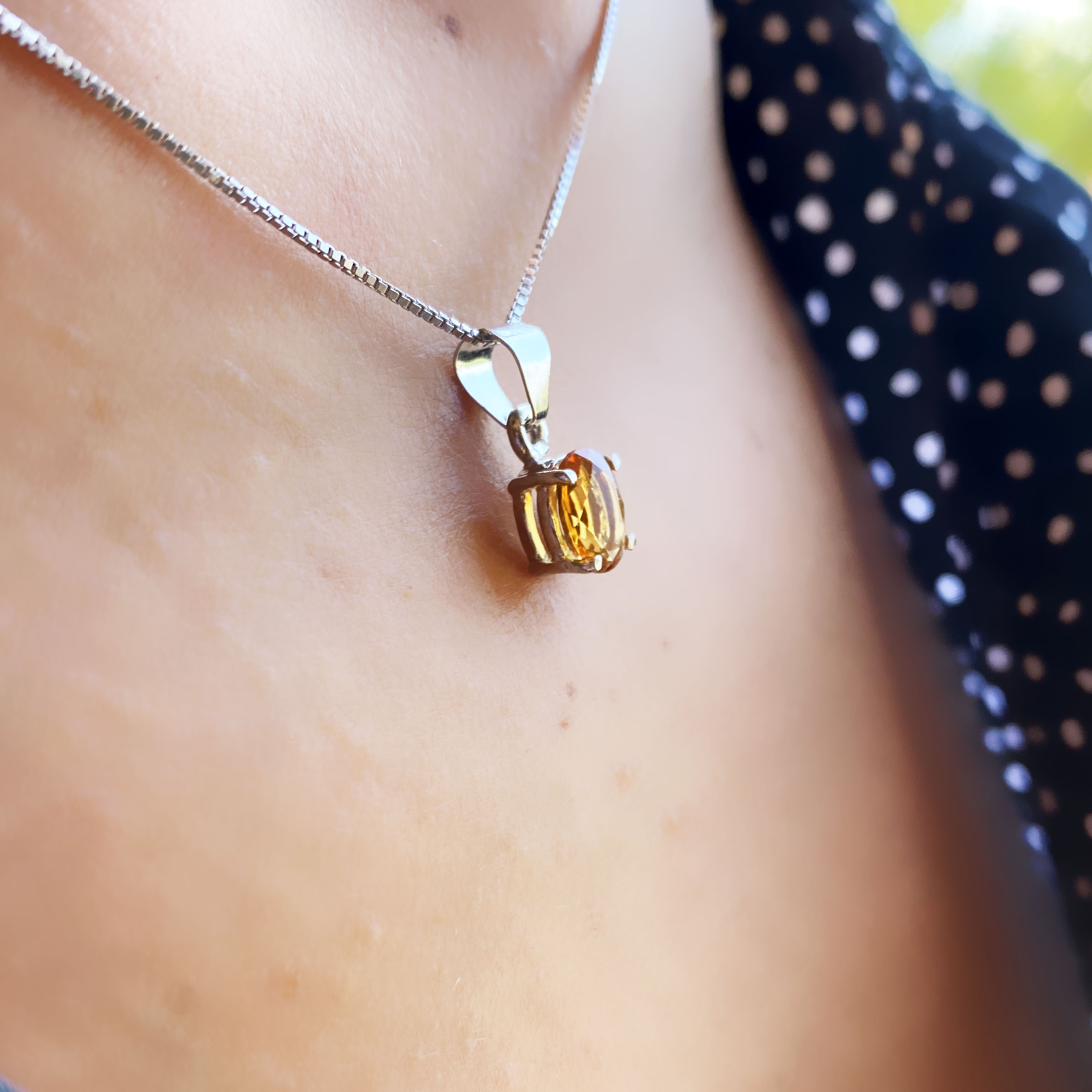 Collana con Ciondolo in argento 925, con bagno galvanico di rodio in oro bianco, con zircone di colore topazio citrino 6×8 mm.