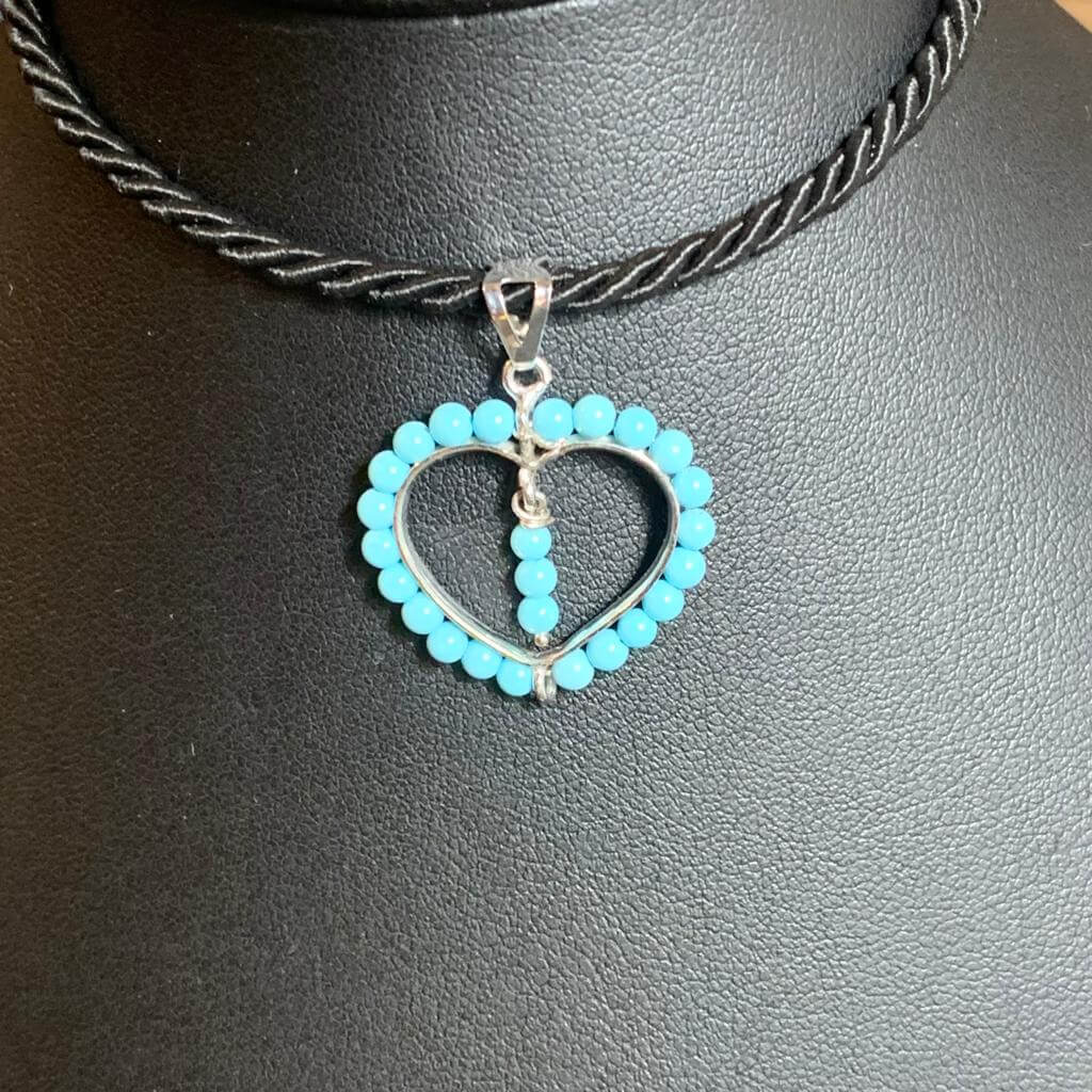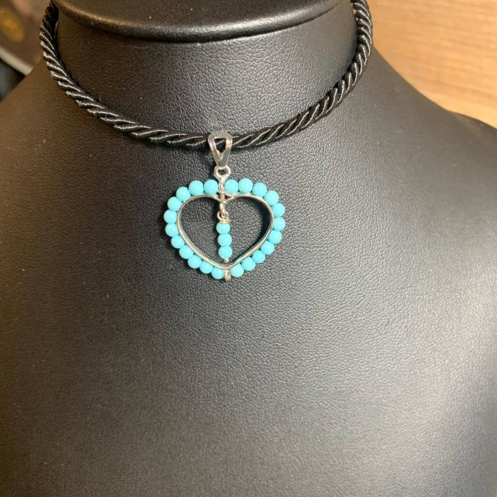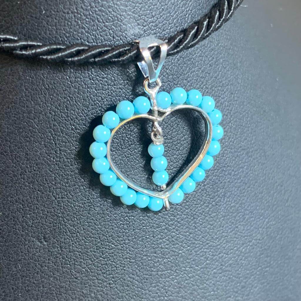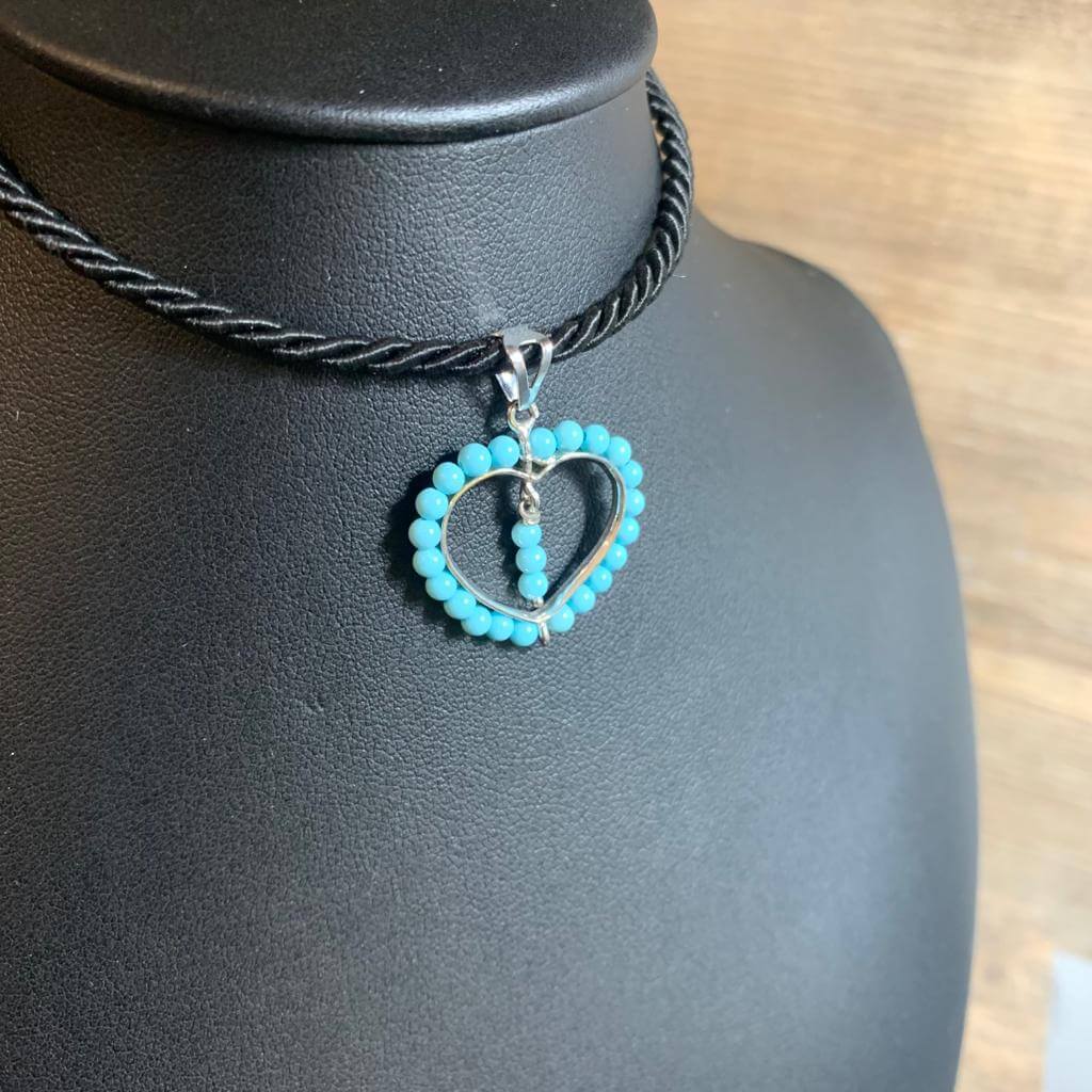 Ciondolo cuoricino in argento 925, con bagno di rodio in oro bianco, con turchese rigenerato in pallini di mm 2,5: diametro ciondolo 2 cm