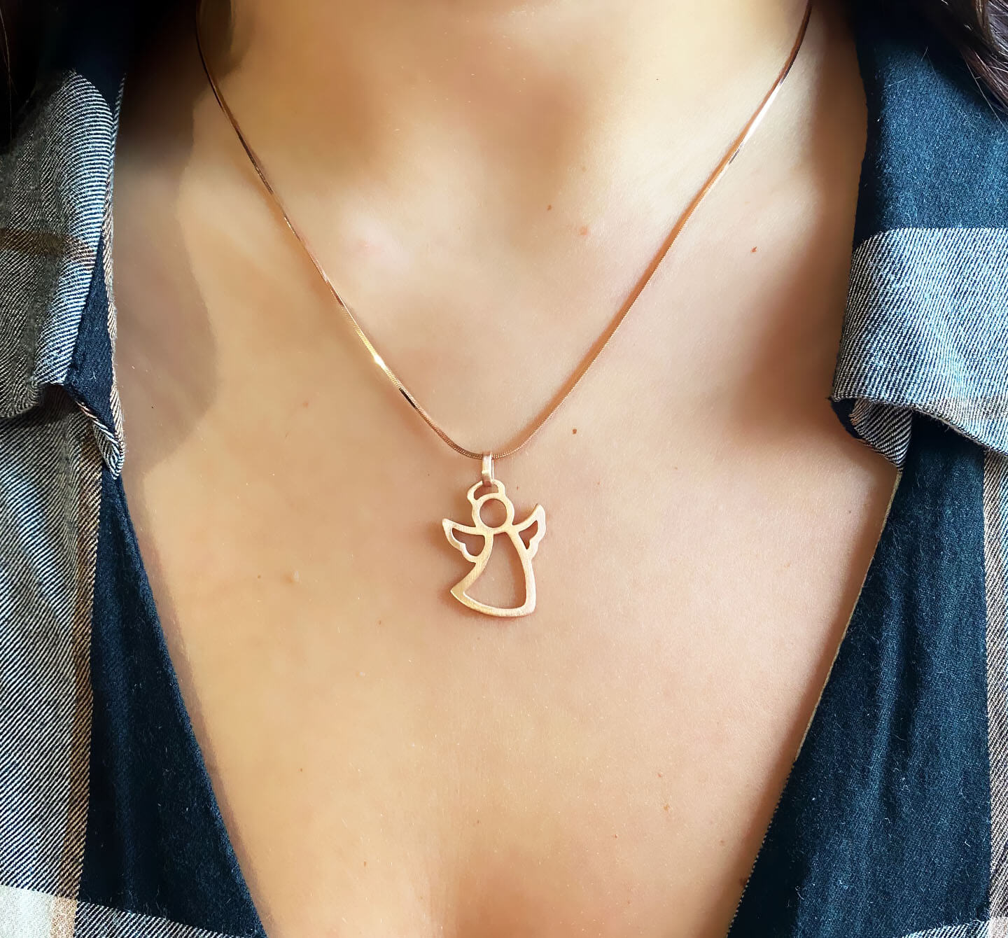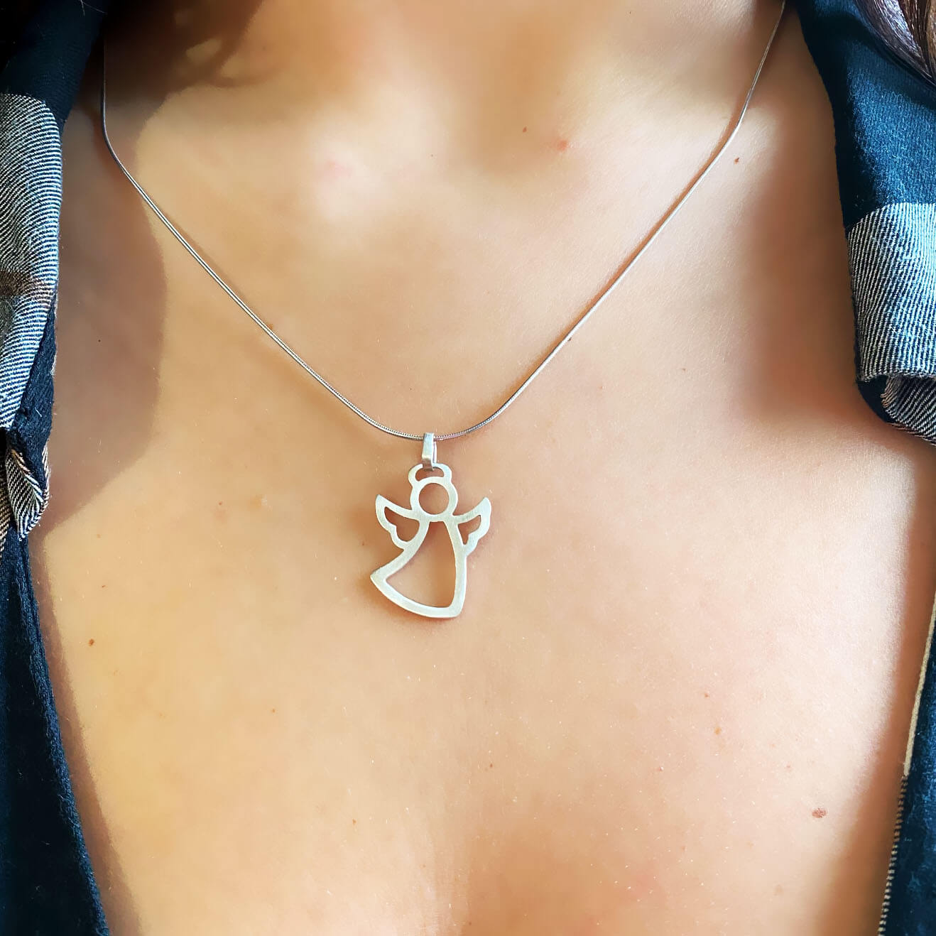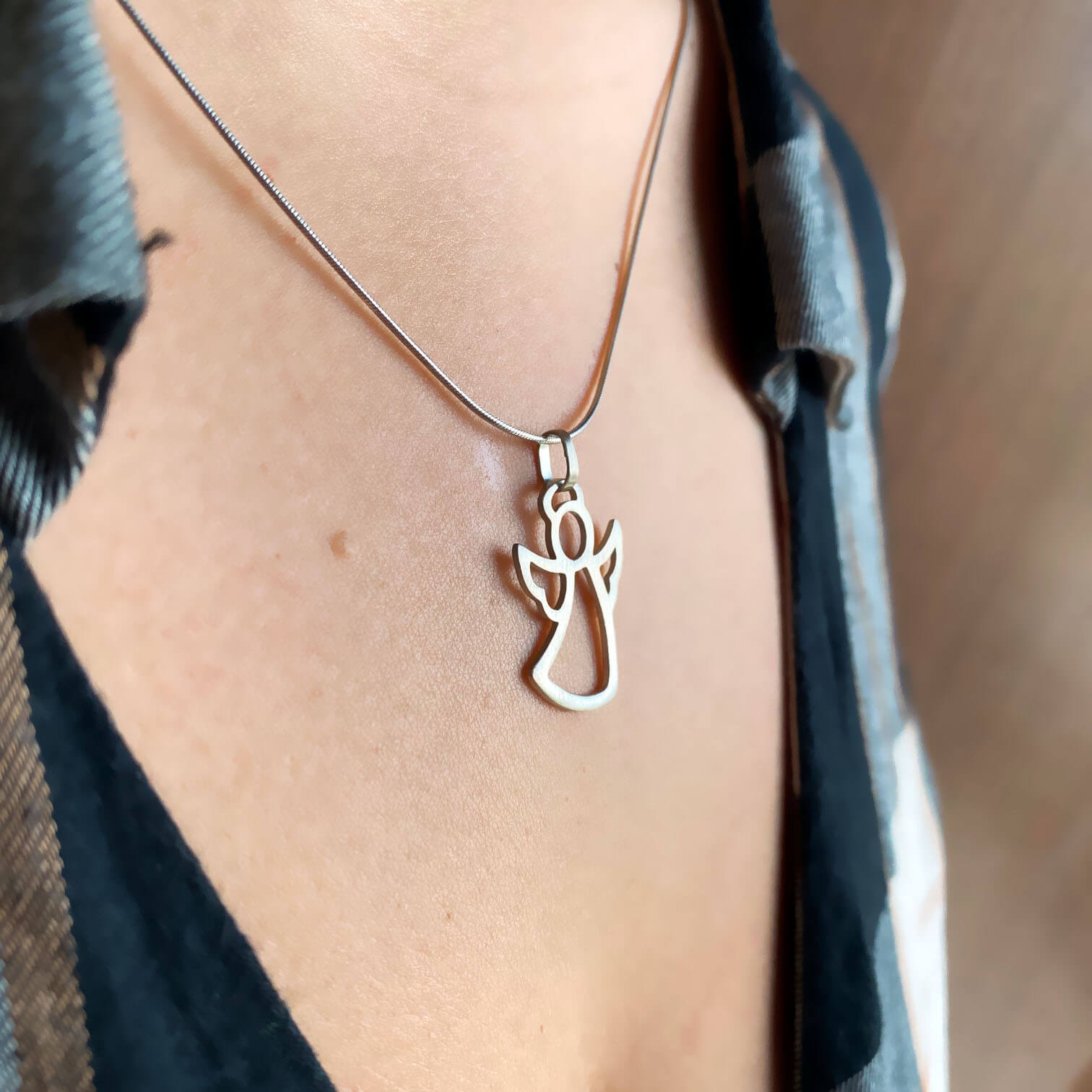 Collana Angelo Protettore in argento 925, ciondolo con finitura satinato, disponibile in due varianti: con bagno galvanico di rodio in oro bianco e bagno galvanico di oro rosa.