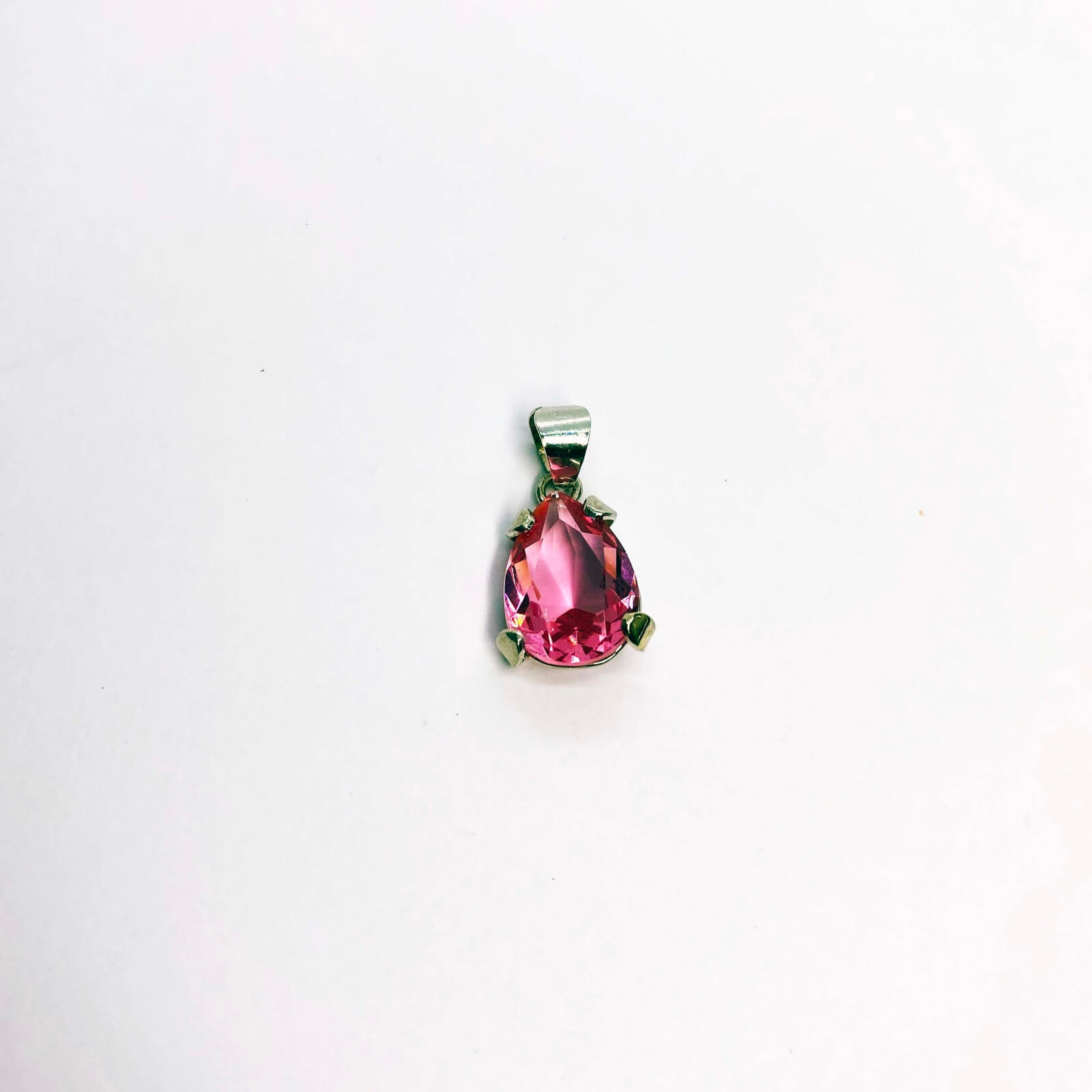 Collana con Ciondolo in argento 925, con bagno galvanico di rodio in oro bianco, con pietra a forma di goccia di colore rosa 14×10 mm.