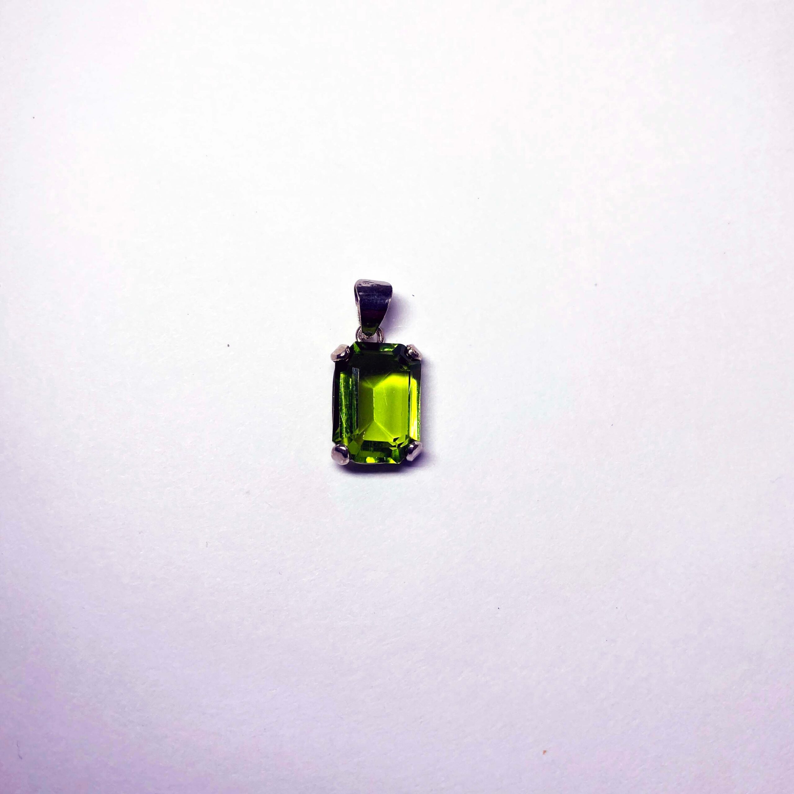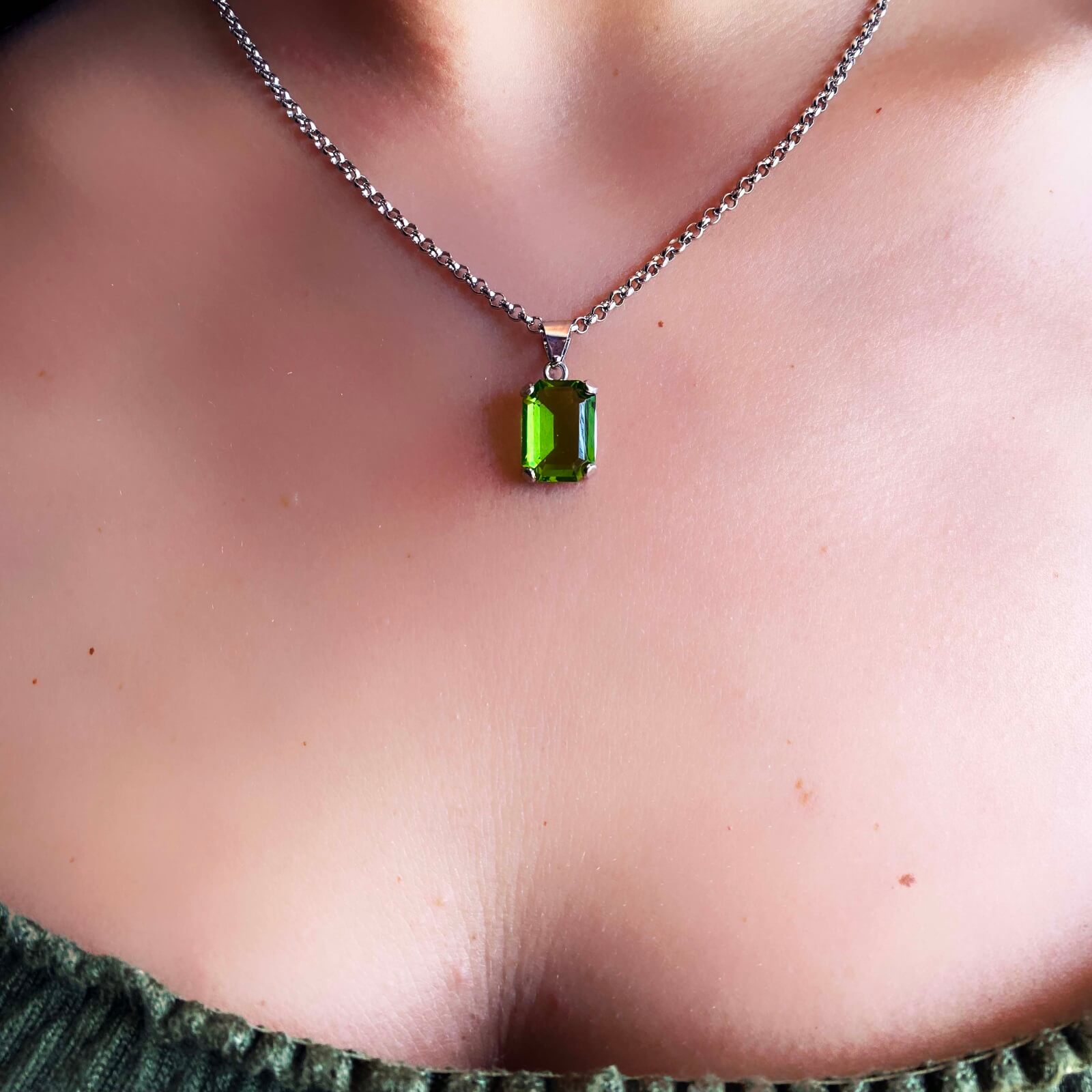 Collana con Ciondolo in argento 925, con bagno galvanico di rodio in oro bianco, con pietra zirconia di colore verde smeraldo ottagonale 14×10 mm.