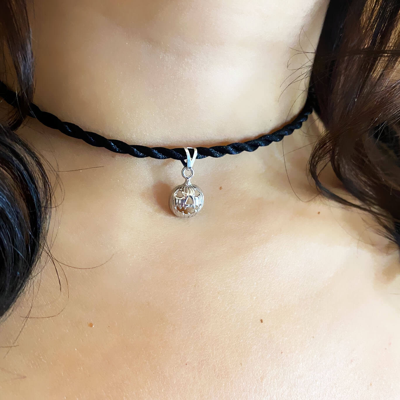 Collana con ciondolo Evil Jack’ o ‘lantern in argento 925, con bagno galvanico di rodio in oro bianco e cordoncino con chiusura in argento regolabile