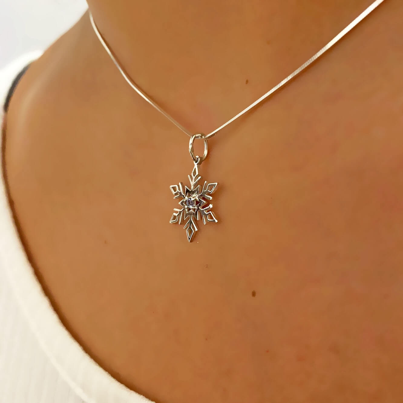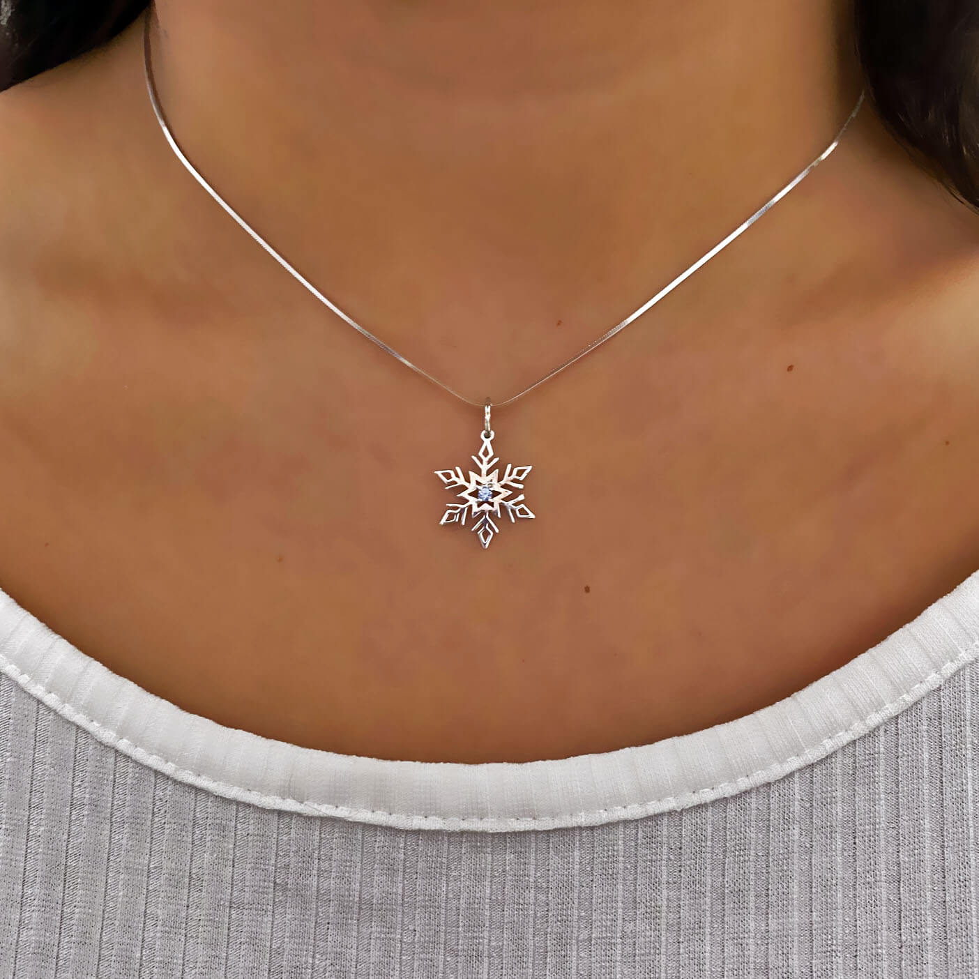 Catenina Veneziana regolabile, con fiocco di neve in argento 925 e pietra zirconia di colore azzurro, con bagno galvanico di rodio in oro bianco.