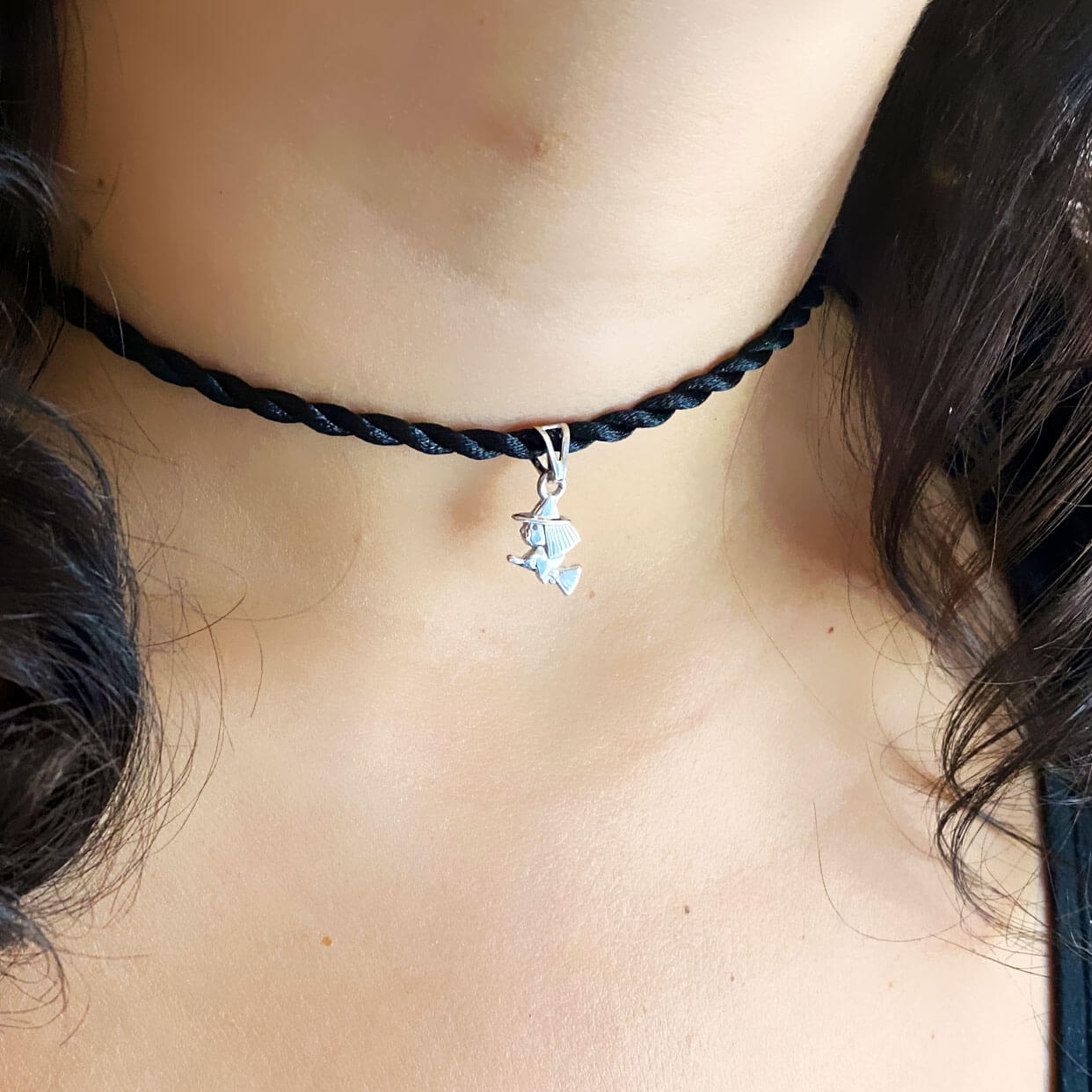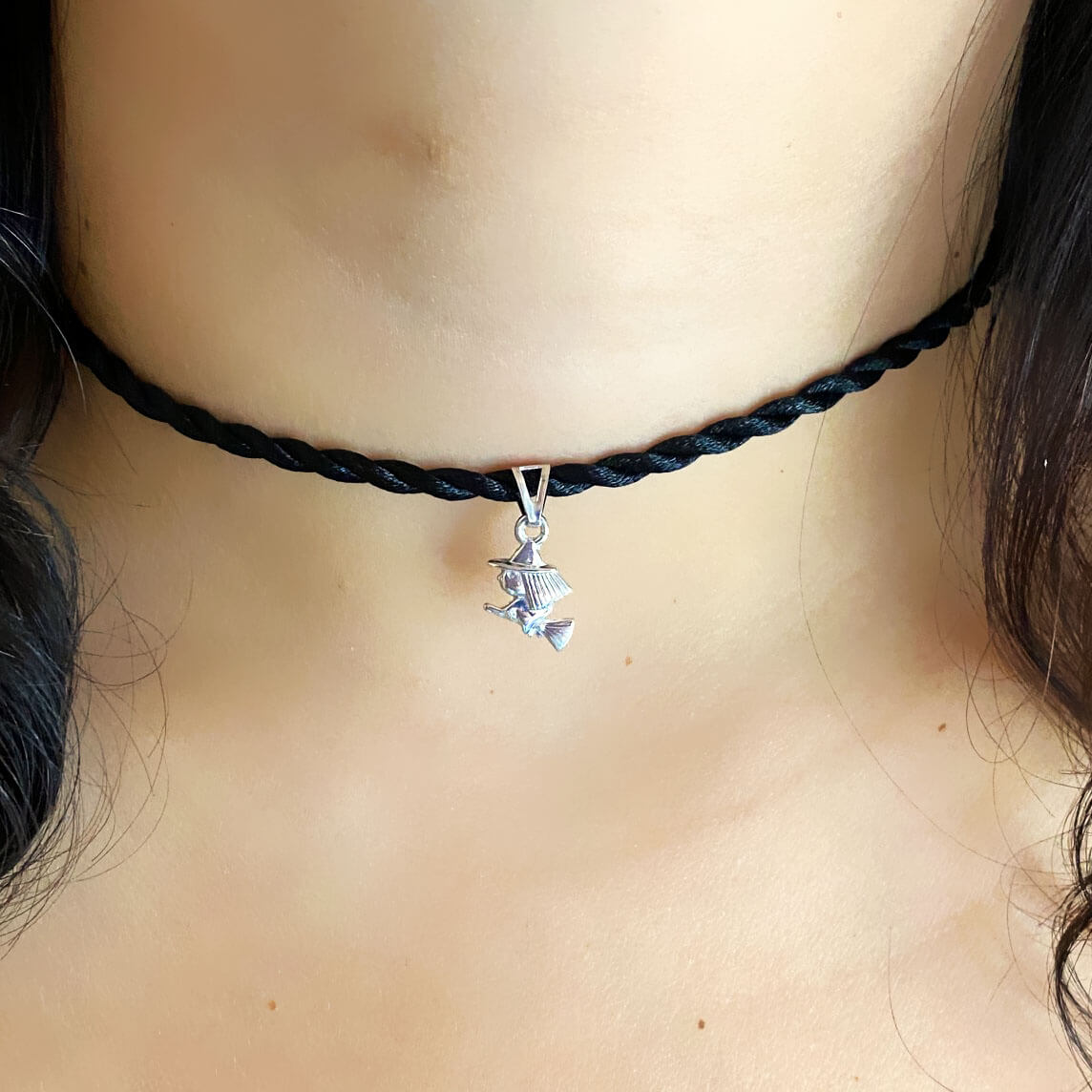 Collana con ciondolo Little Witch in argento 925, con bagno galvantico di rodio in oro bianco e cordoncino con chiusura in argento regolabile