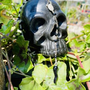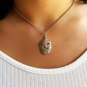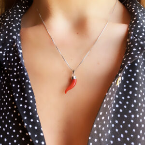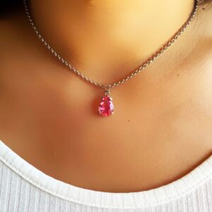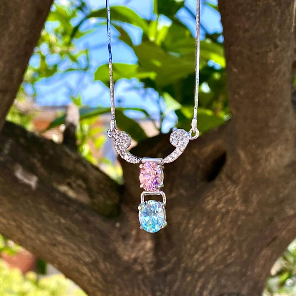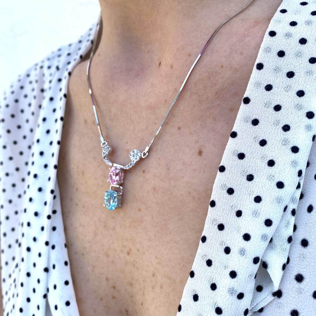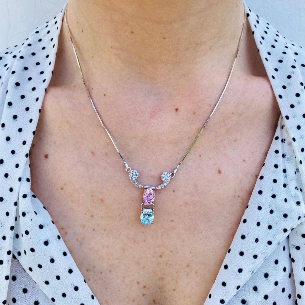 Collier in argento 925, con bagno di rodio in oro bianco, con elemento centrale in argento, zirconi bianchi e pietre dure colorate. È possibile avere la collana con due pietre rosa o due pietre celesti.