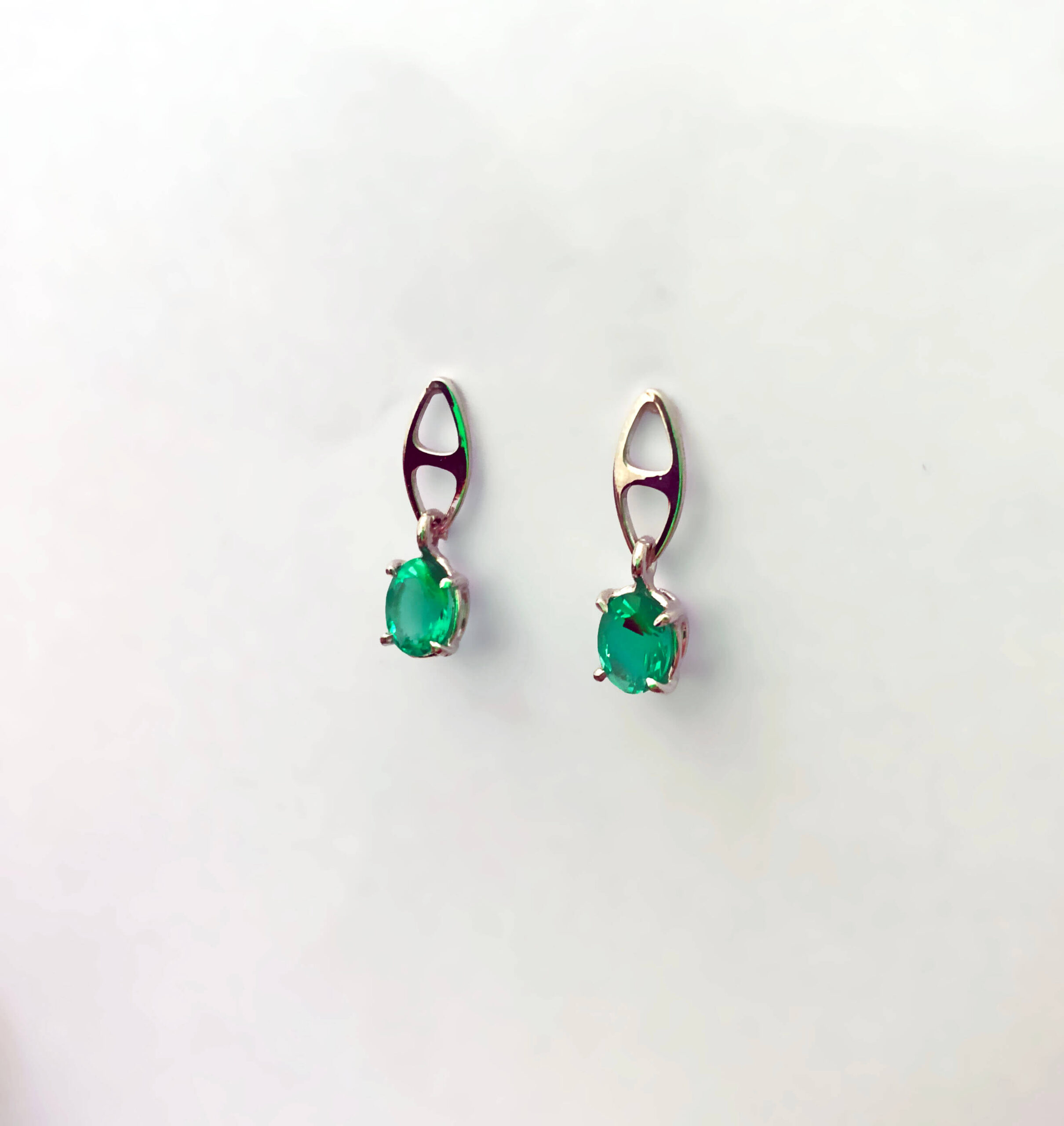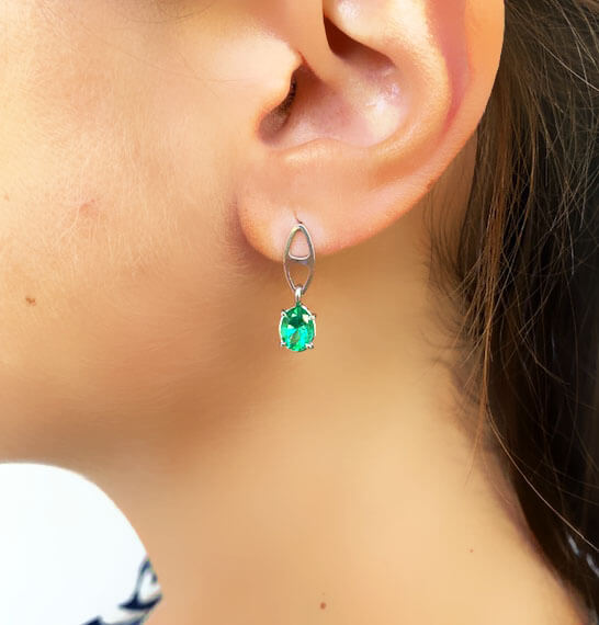 Orecchini pendenti in argento 925, con bagno galvanico di rodio in oro bianco, con pietre smeraldo zirconia 5×7 mm.