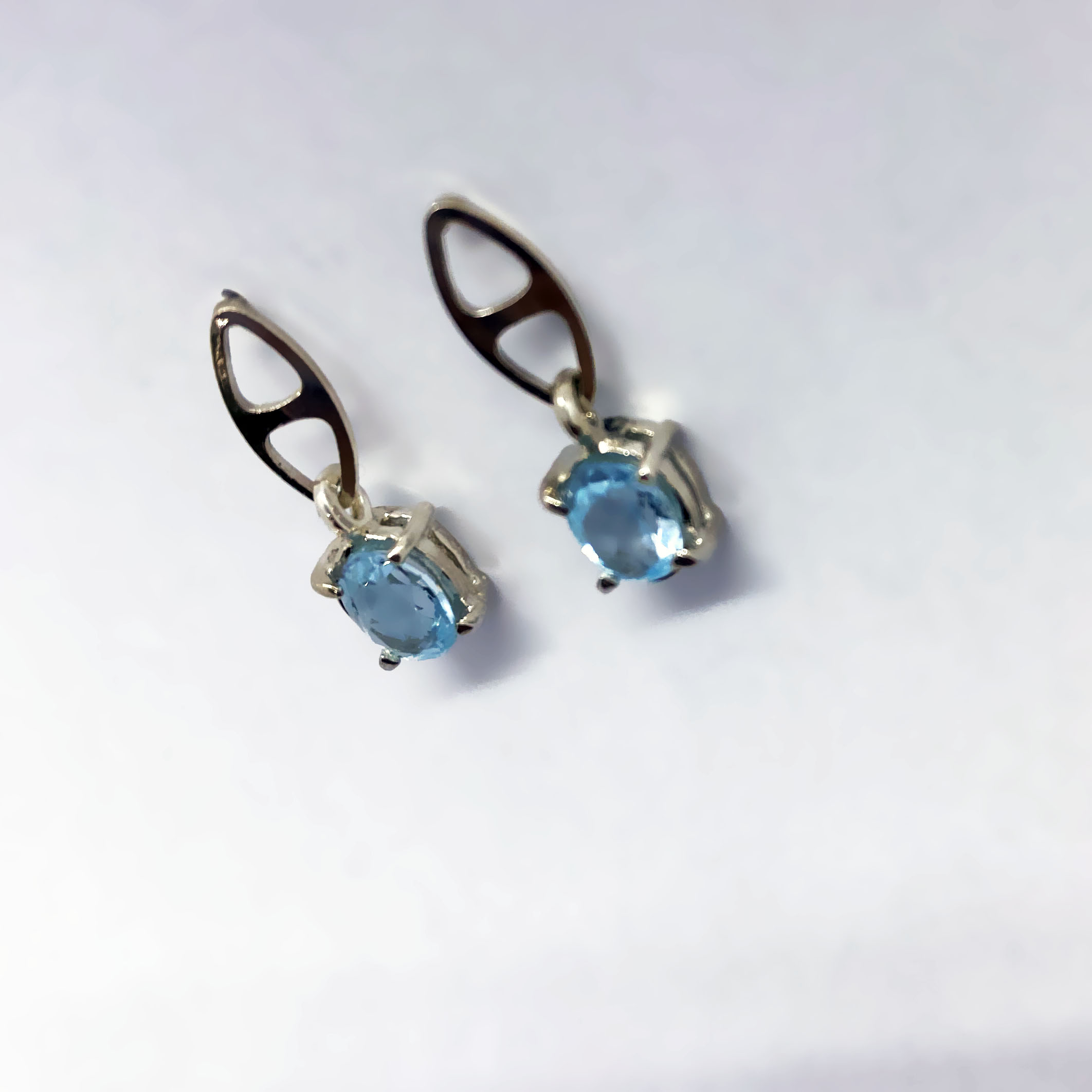 Orecchini pendenti in argento 925, con bagno galvanico di rodio in oro bianco, con pietre di topazio azzurro idrotermali 5×7 mm.