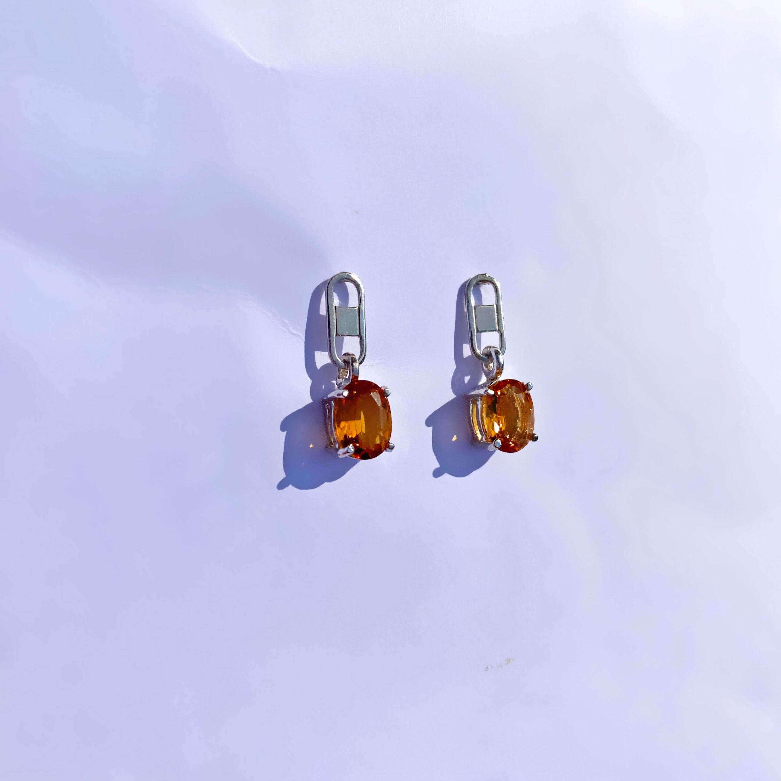 Orecchini pendenti in argento 925/chiusura pin; con bagno galvanico di rodio in oro bianco, con pietre topazio citrino mm 6×8.