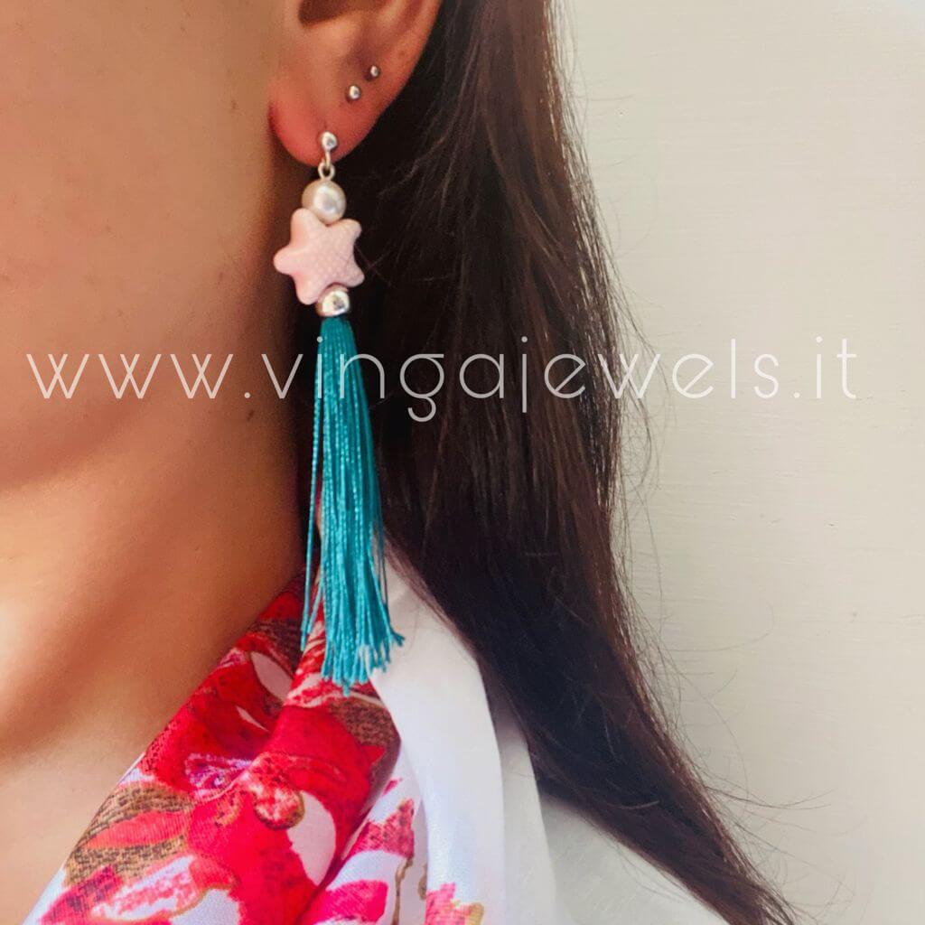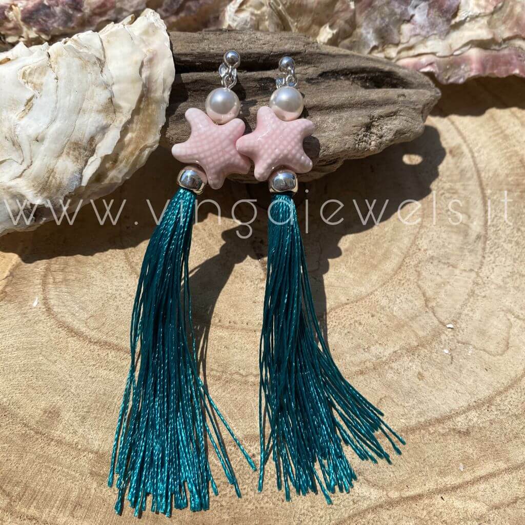 Splendide perle Swarovski, delicate stelle marine rosate in vetro-ceramica , fluttuanti frange verdi smeraldo, il tutto montato in argento 925 con bagno di rodio in oro bianco: ecco la nostra rappresentazione di una Sirenetta.