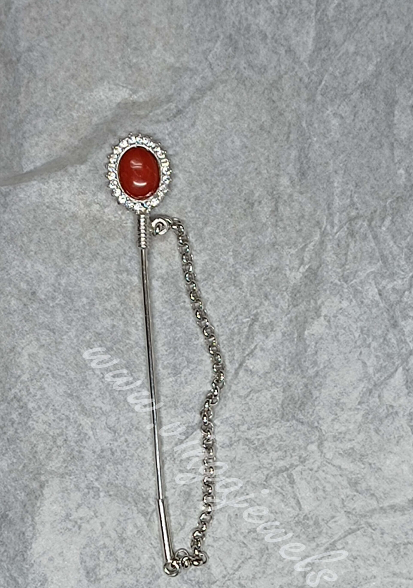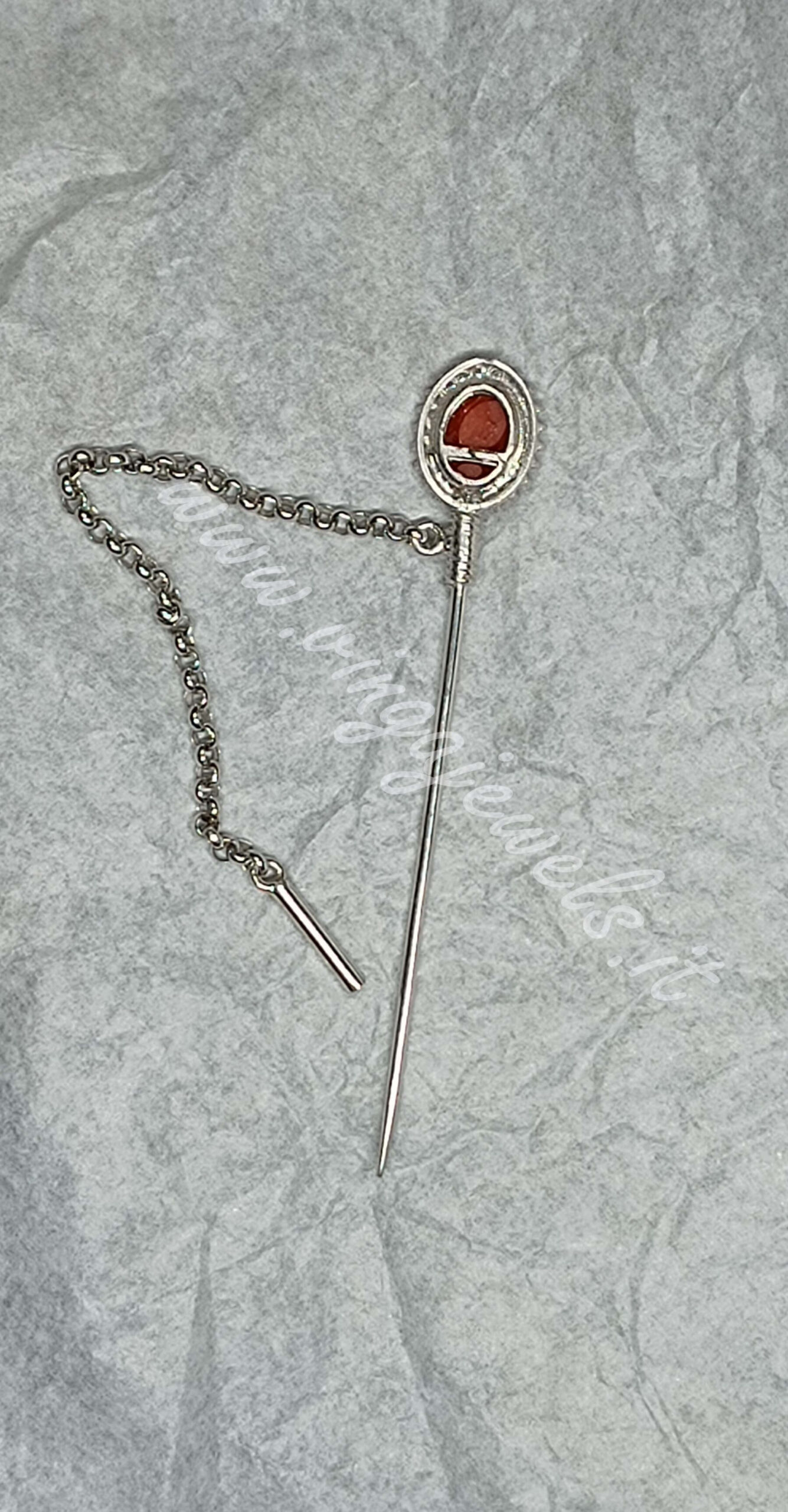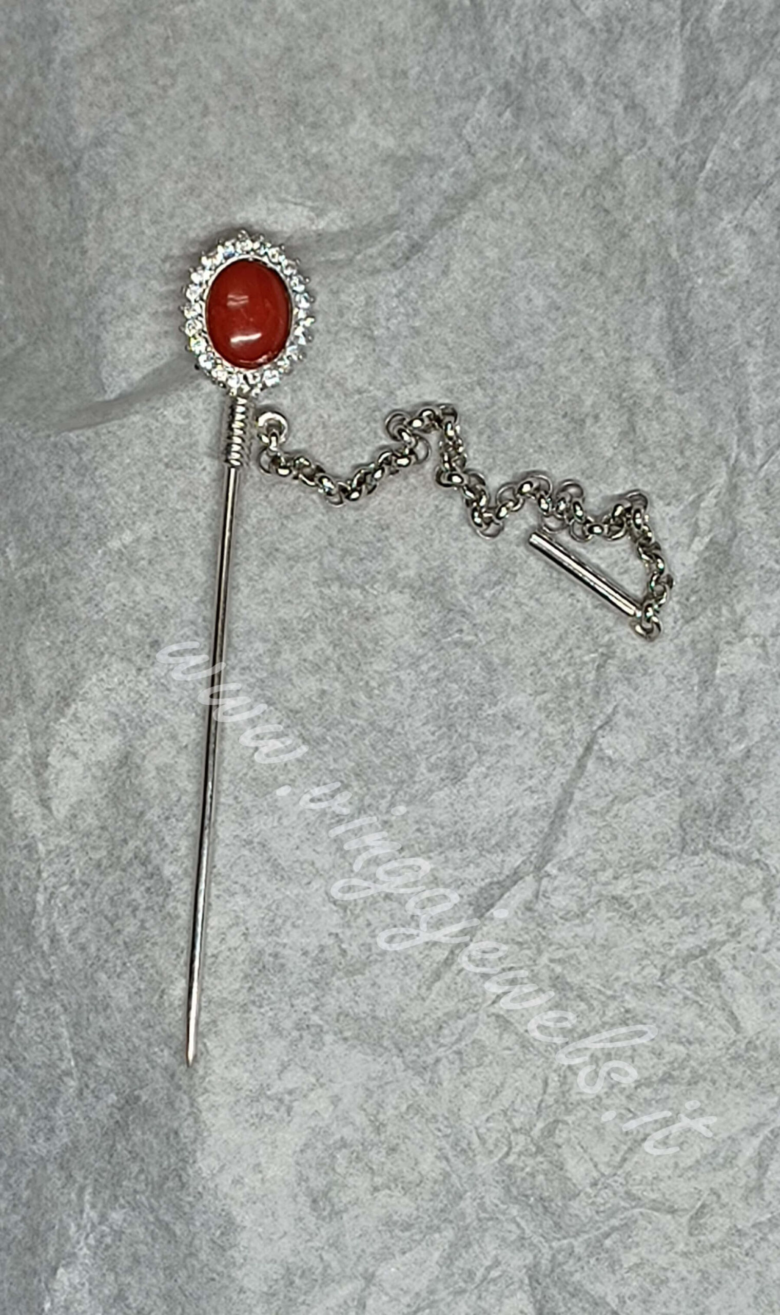 Spillone per Cravatta/Foulard in Argento rodio bianco 925/1000 corallo rosso autentico contornato da zirconi,corredato da sicurezza con catena
